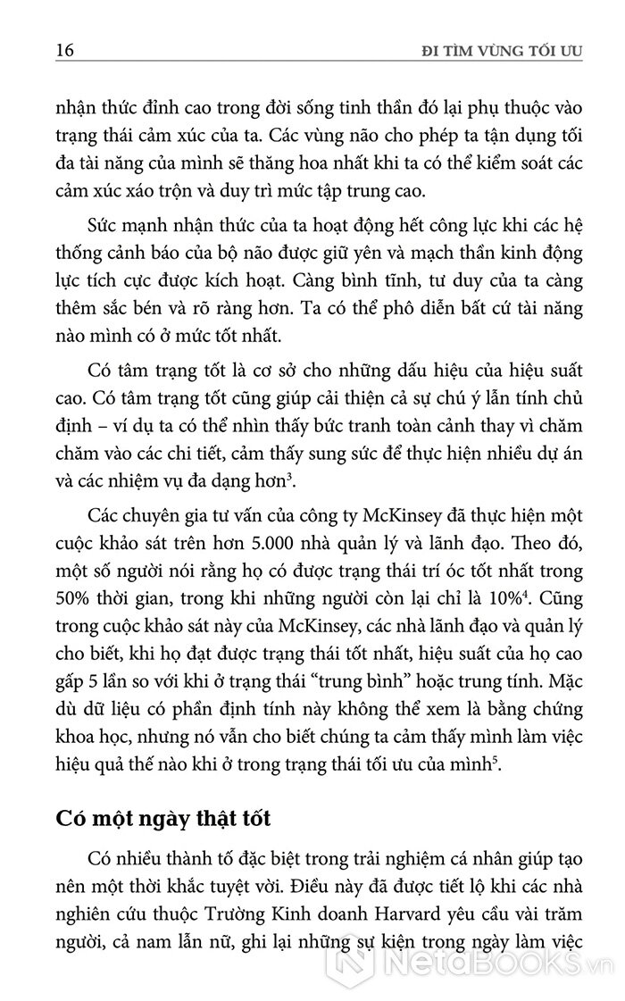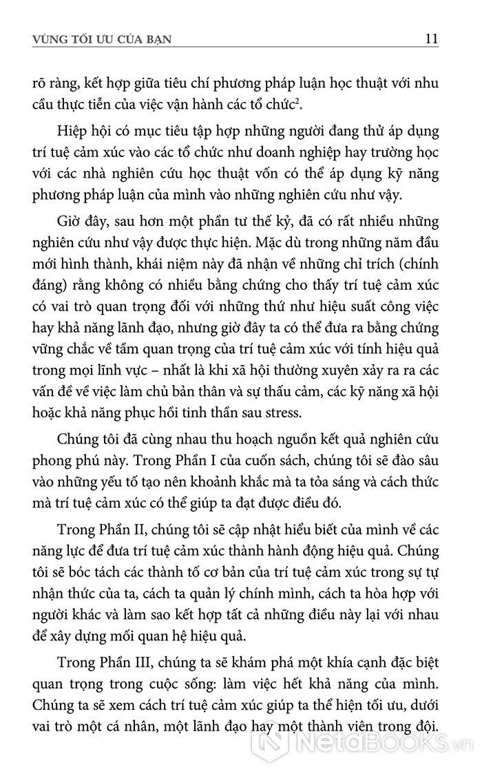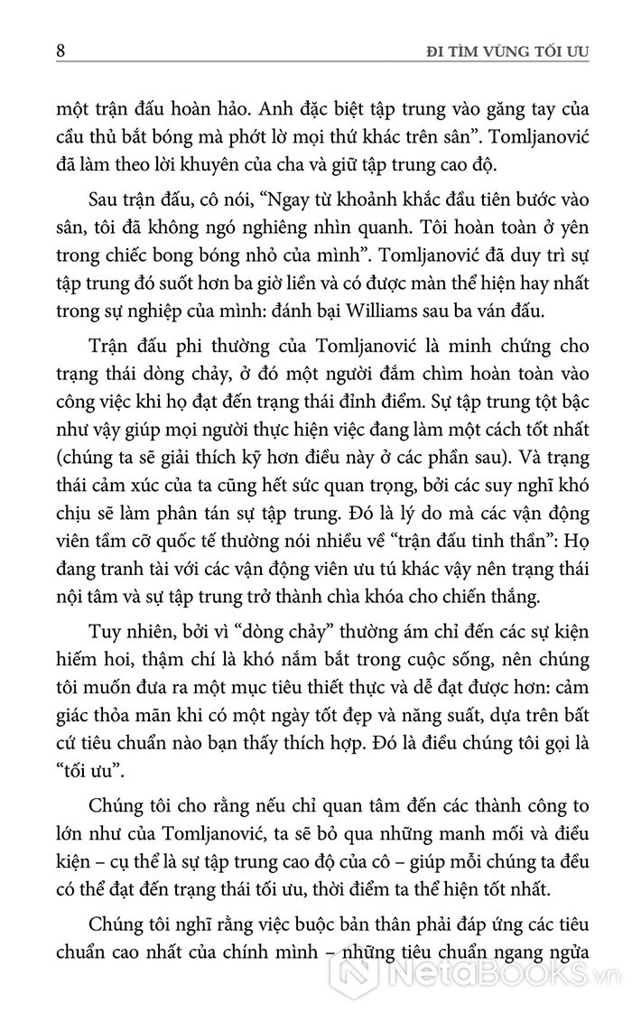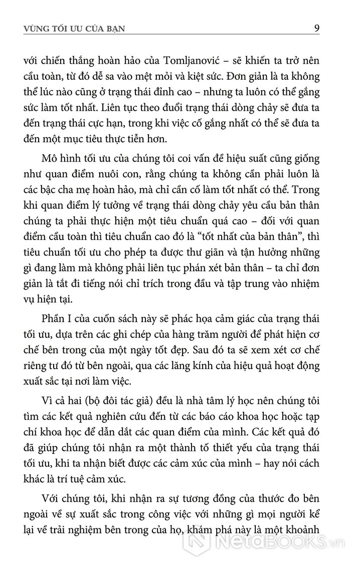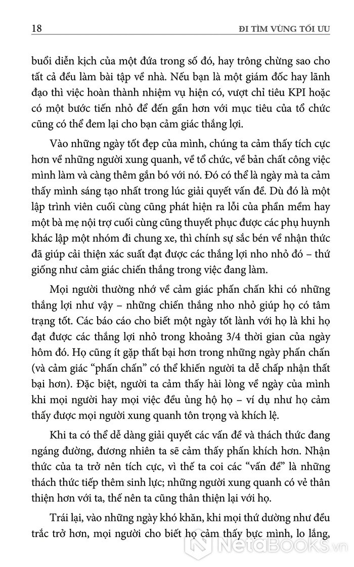 Đi tìm vùng tối ưu - Tác phẩm đem đến một thông điệp quan trọng, rằng thay vì làm việc cật lực để rồi rơi vào mệt mỏi, trí tuệ cảm xúc giúp mỗi cá nhân duy trì phong độ ổn định, vừa hoàn thành công việc, vừa gìn giữ sức khỏe tinh thần. Đây cũng là cuốn sách hiếm hoi cho thấy “một ngày tốt đẹp” có giá trị lâu dài hơn nhiều so với một khoảnh khắc đỉnh cao ngắn ngủi.