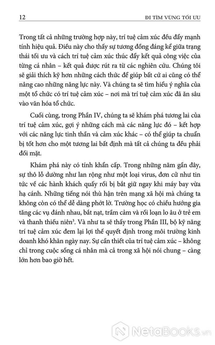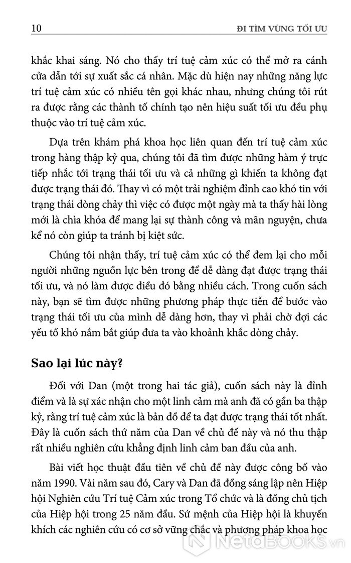 Trong thời đại nhiều biến động, khi áp lực công việc rất dễ dẫn đến kiệt sức, quyển sách Đi Tìm Vùng Tối Ưu đã chỉ ra con đường bền vững hơn: vận dụng trí tuệ cảm xúc (Emotional Intelligence - EI) để xây dựng sự tập trung, nuôi dưỡng năng lượng và gắn kết cảm xúc. Là tác phẩm từ hai chuyên gia tâm lý nổi tiếng thế giới là Daniel Goleman và Cary Cherniss, Đi Tìm Vùng Tối ưu đã nhanh chóng được cộng đồng lãnh đạo & chuyên gia hàng đầu thế giới đánh giá cao ngay khi vừa ra mắt.
