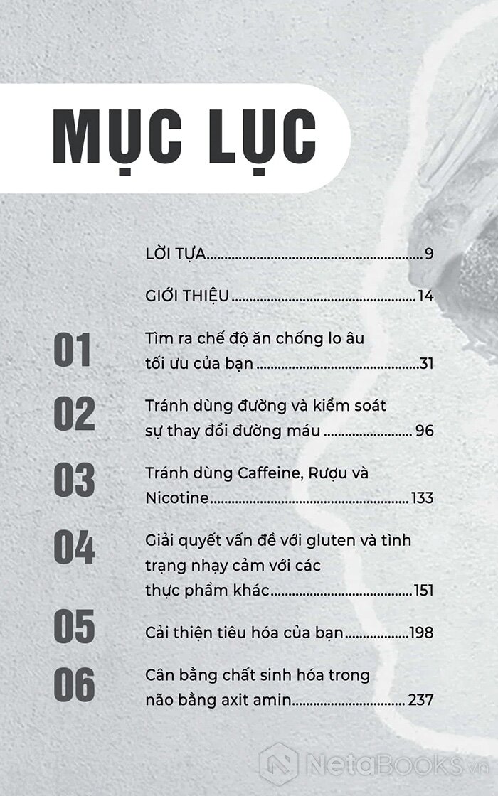 Tác giả cũng cung cấp bảng phân tích 4 chế độ ăn chống lo âu tùy theo mức độ nhạy cảm của cơ thể, cùng hướng dẫn chi tiết để tự theo dõi, tự điều chỉnh và phát hiện nhóm thực phẩm gây kích ứng tâm lý. Điểm đặc biệt của cuốn sách là tính cá nhân hóa cao, rằng mỗi người cần tìm ra nguyên nhân lo âu dựa trên sinh hóa riêng, không có một công thức chung cho tất cả.