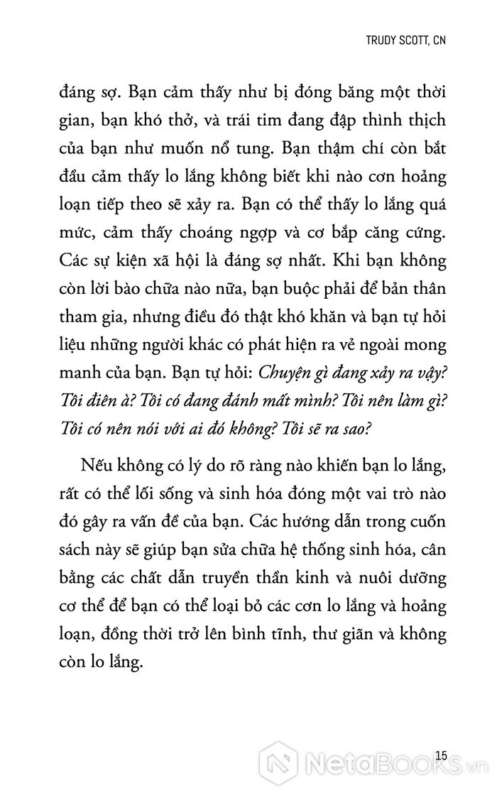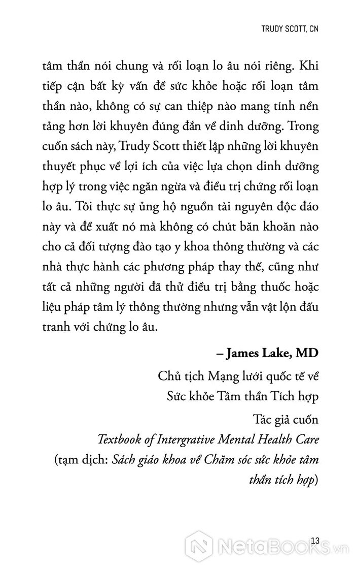 Trong khi nhiều phương pháp đi ều tr ị lo âu hiện nay vẫn chủ yếu dựa vào thuốc và liệu pháp tâm lý, Trudy Scott, một chuyên gia dinh dưỡng giàu kinh nghiệm lâm sàng, đã tiếp cận vấn đề từ một hướng hoàn toàn khác: hệ sinh hóa của não bộ và vai trò của thực phẩm. Cuốn sách đặt nền móng cho một giả thuyết quan trọng: thói quen ăn uống và sự thiếu hụt vi chất dinh dưỡng có thể là yếu tố gốc rễ gây ra lo âu, hoảng loạn và các rối loạn tâm thần phổ biến khác.
