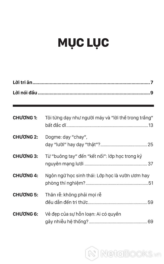Lấy cảm hứng từ phong trào điện ảnh Dogme 95 (Đan Mạch) và triết lý giáo dục Dogme ELT của Scott Thornbury, cuốn sách mở ra hành trình từ những lớp học rập khuôn, đầy giáo án, băng đĩa và slide… đến một không gian học tập sống động, sáng tạo và đầy tính người, nơi học trò được nói, được hỏi, được tò mò - và người thầy biết “biến mất” đúng lúc để sự học tự khởi sinh.