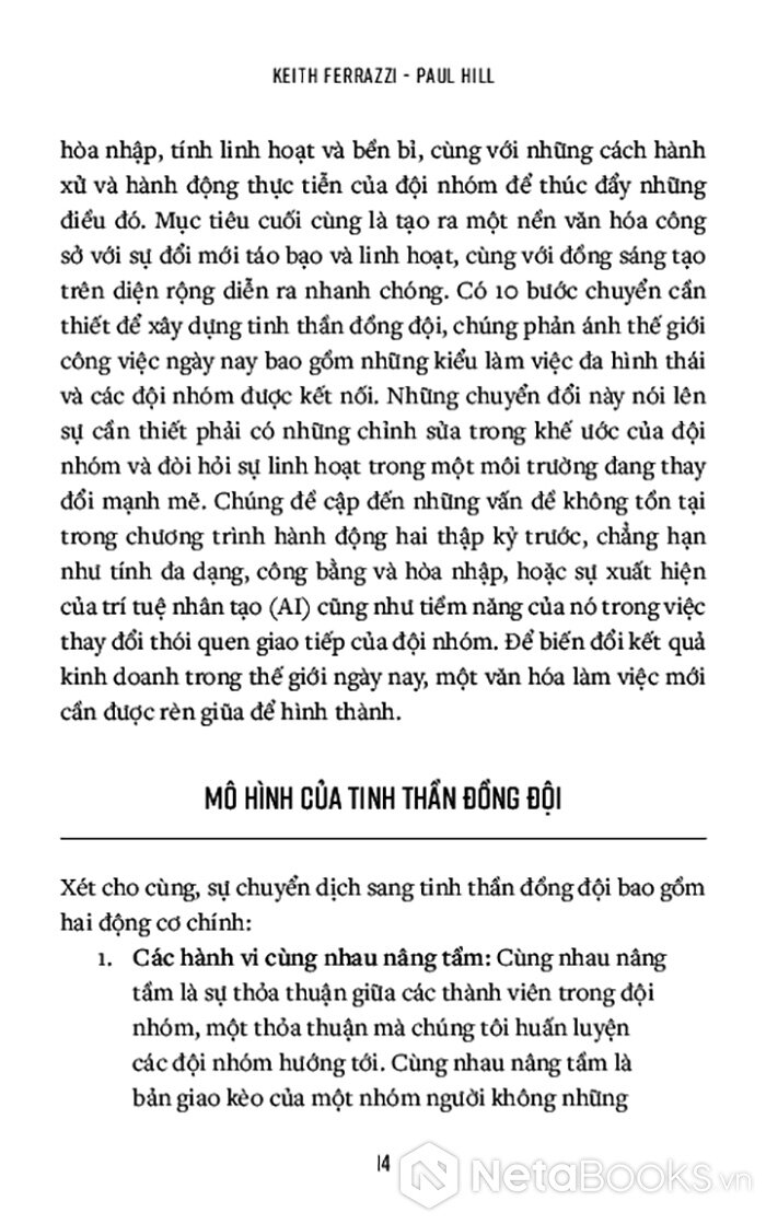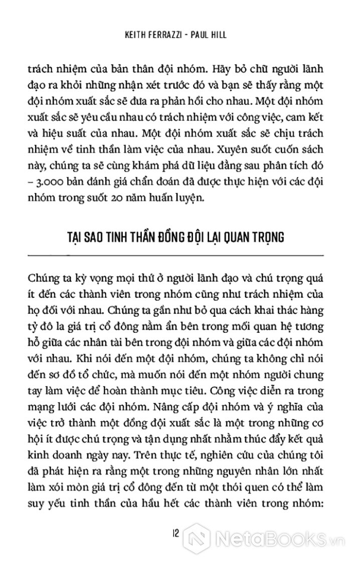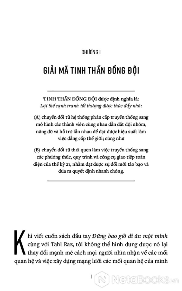 Dựa trên hơn 20 năm nghiên cứu hơn 3.000 đội nhóm, huấn luyện viên nổi tiếng thế giới và tác giả sách bán chạy số 1 Keith Ferrazzi đã khám phá ra bí quyết làm nên thành công của 15% đội nhóm hàng đầu thế giới. Trong Đừng bao giờ lãnh đạo một mình, Ferrazzi đã làm rõ những gì được mong đợi ở các thành viên trong nền văn hóa mới dựa trên tinh thần đồng đội - một nền văn hóa tổ chức linh hoạt, hòa nhập, sáng tạo và luôn phá bỏ giới hạn. Tinh thần đồng đội là sự kết hợp của: