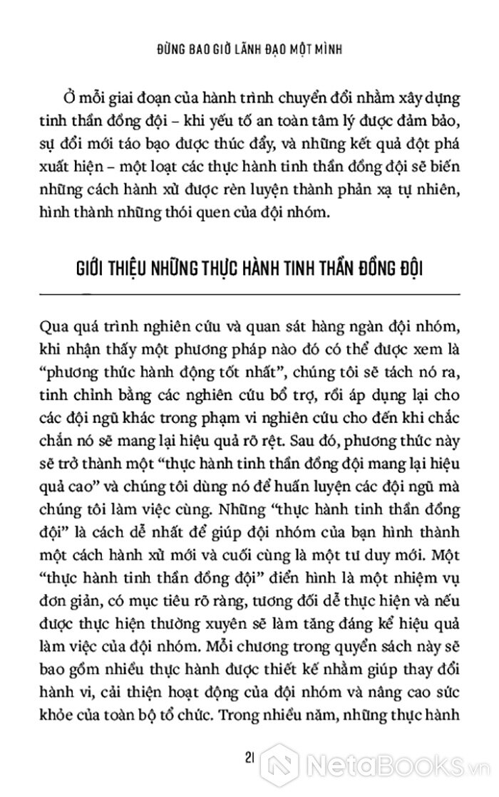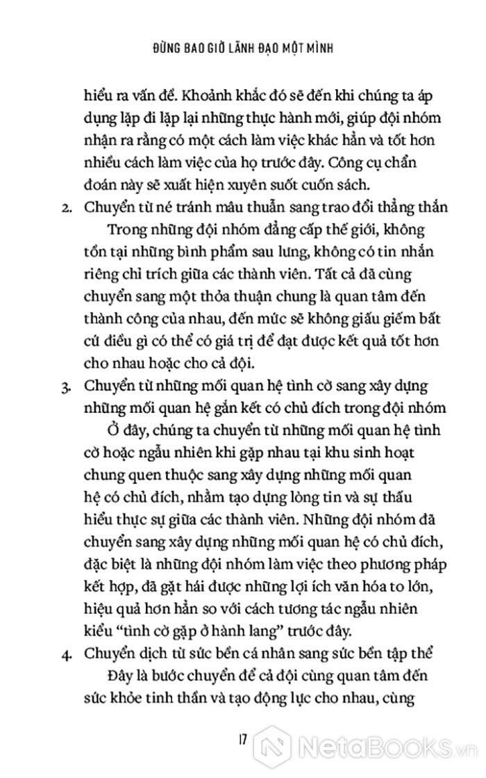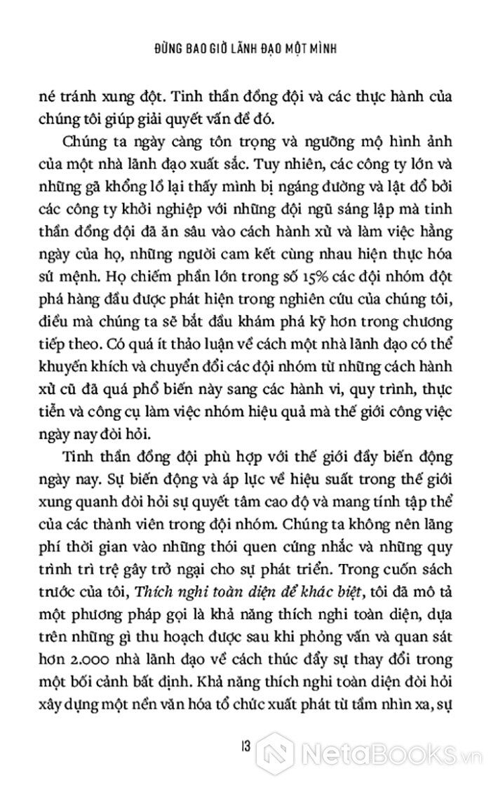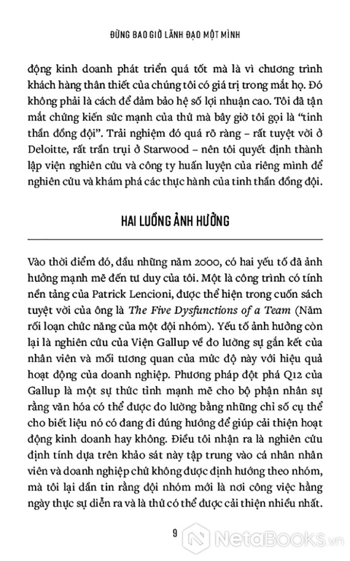 "Đừng bao giờ lãnh đạo một mình" là một lộ trình từng bước thiết yếu cho mọi thành viên trong đội ngũ và tất cả các nhà lãnh đạo trên hành trình đưa đội nhóm từ mức trung bình lên phi thường.