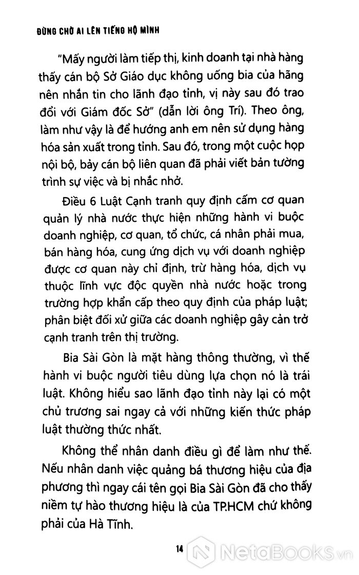 Đừng Chờ Ai Lên Tiếng Hộ Mình là lời kêu gọi mọi người đấu tranh lại những điều xấu và sự bất công vô lý đang tồn tại trong cuộc sống. Tác giả tin rằng hành trình sống của một con người là chế ngự điều xấu trong chính bản thân và góp phần cải thiện điều đó ở ngoài xã hội.