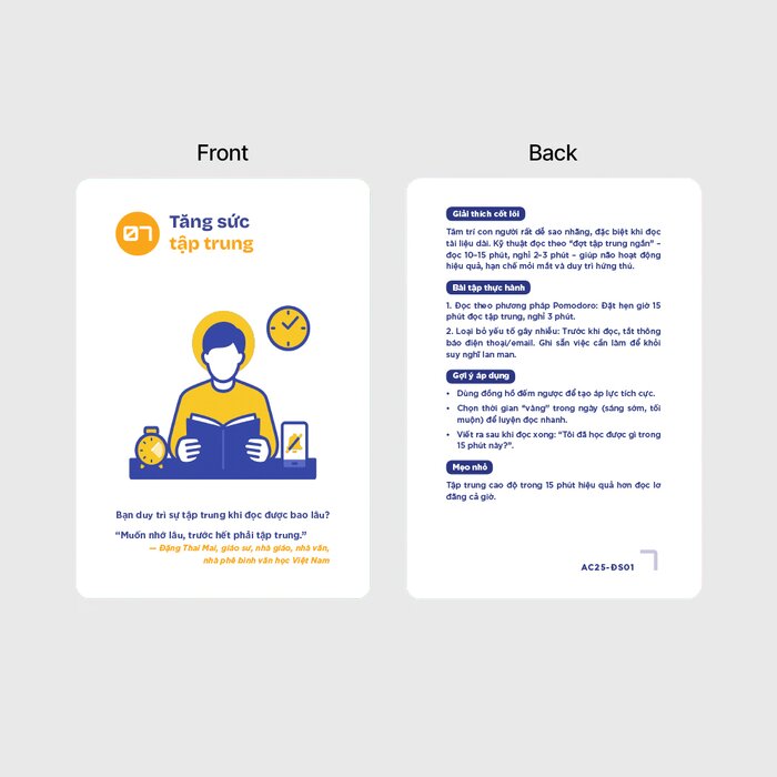 - Mỗi thẻ không chỉ là lý thuyết mà đều có “bài tập thực hành cụ thể” ở mặt sau. Thiết kế này giúp bạn biến kiến thức thành kỹ năng áp dụng được ngay.