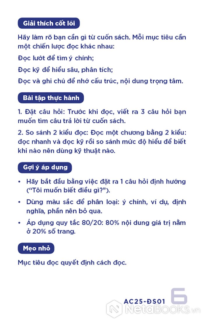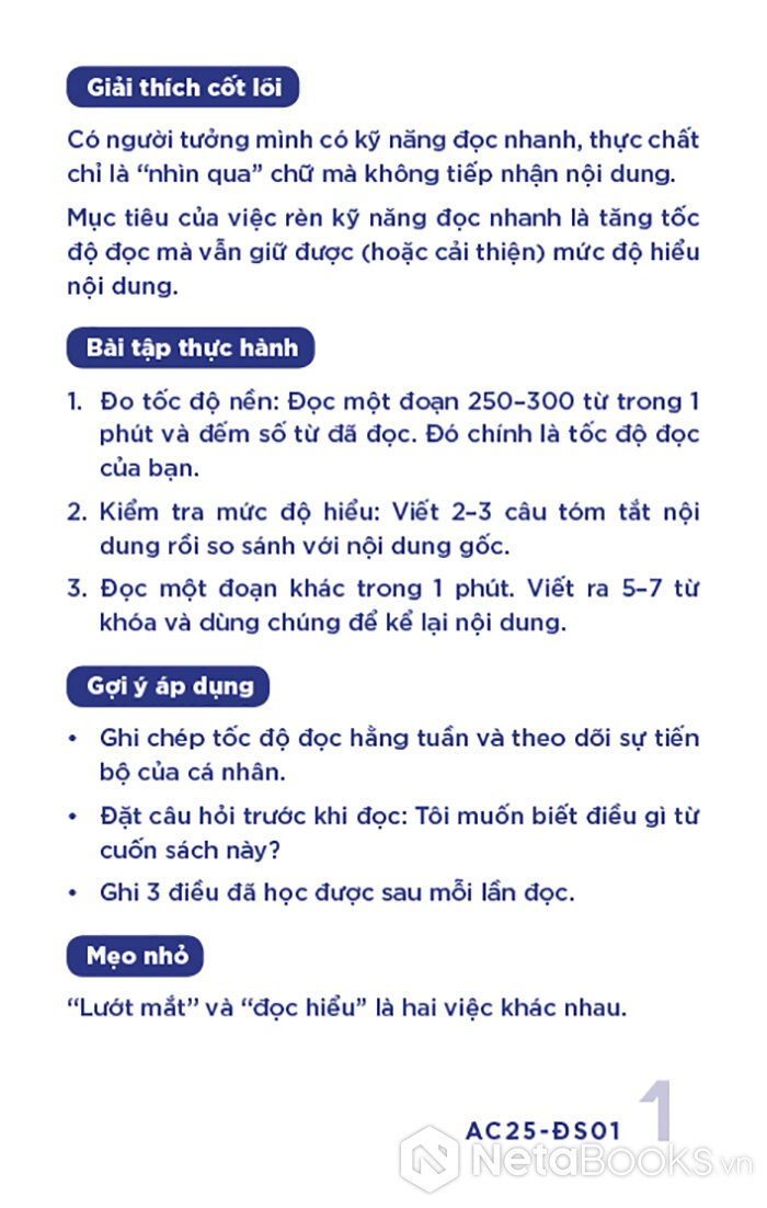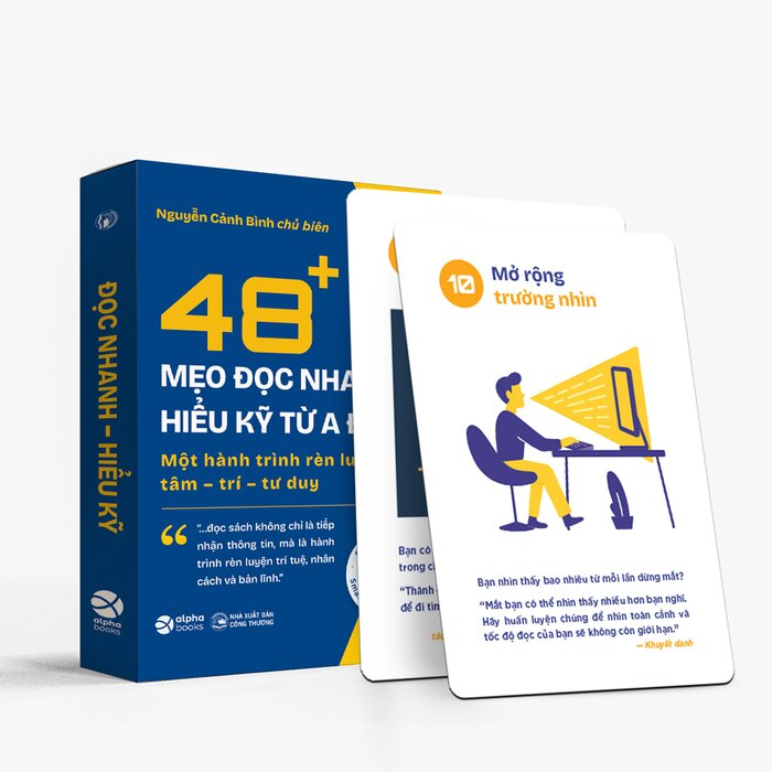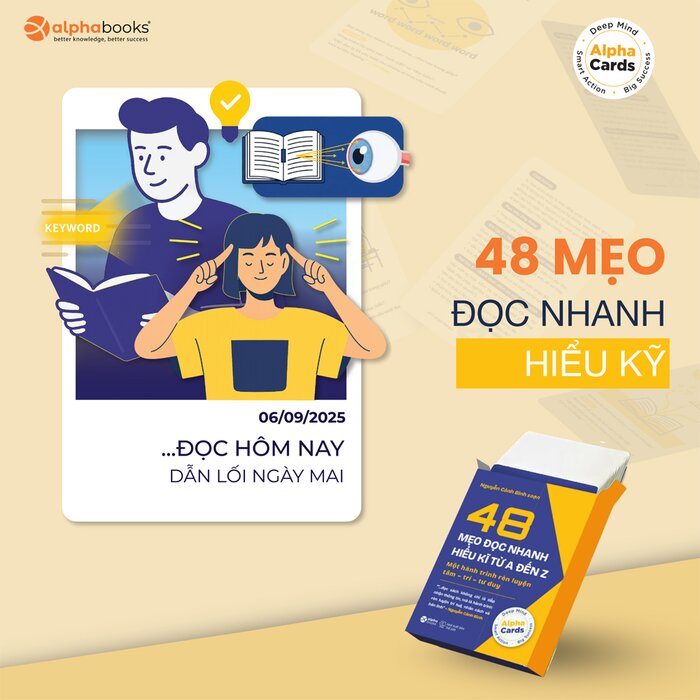 Bộ thẻ 48+ mẹo đọc nhanh hiểu kỹ từ A đến Z là bộ công cụ thực chiến, đúc kết từ những kinh nghiệm thực tế, giúp bạn rèn luyện kỹ năng đọc hiệu quả như rèn luyện thể lực. Đọc là hành trình rèn luyện trí tuệ, nhân cách và bản lĩnh; đọc để sáng tạo, để đi xa hơn những gì đơn thuần trên mặt chữ. Hãy đọc thông minh, hiệu quả để vững vàng và thành công trên hành trình tri thức của mình.