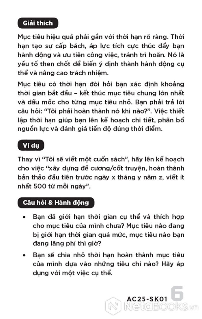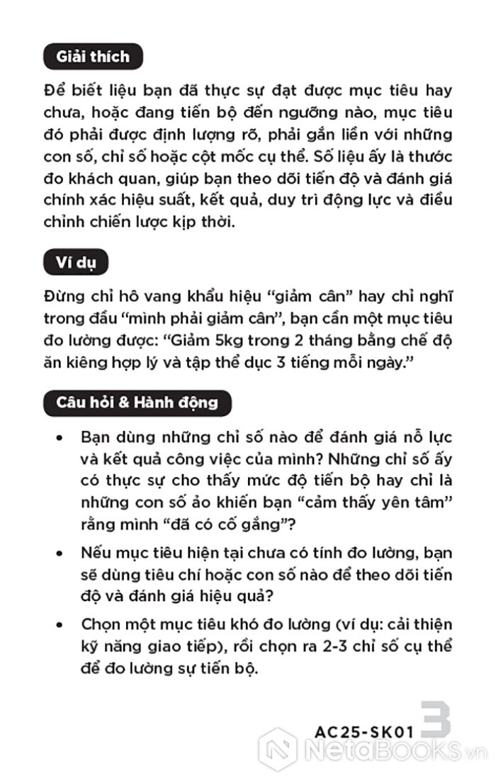Khung lập kế hoạch & theo dõi: Chỉ ra các mô hình và công cụ để biến mục tiêu thành kế hoạch hành động chi tiết. Bạn sẽ học cách chia nhỏ mục tiêu lớn thành các nhiệm vụ con (Work Breakdown Structure), thiết lập các chỉ số đo lường hiệu suất then chốt (KPIs), và xây dựng thói quen theo dõi tiến độ hằng ngày, hằng tuần.