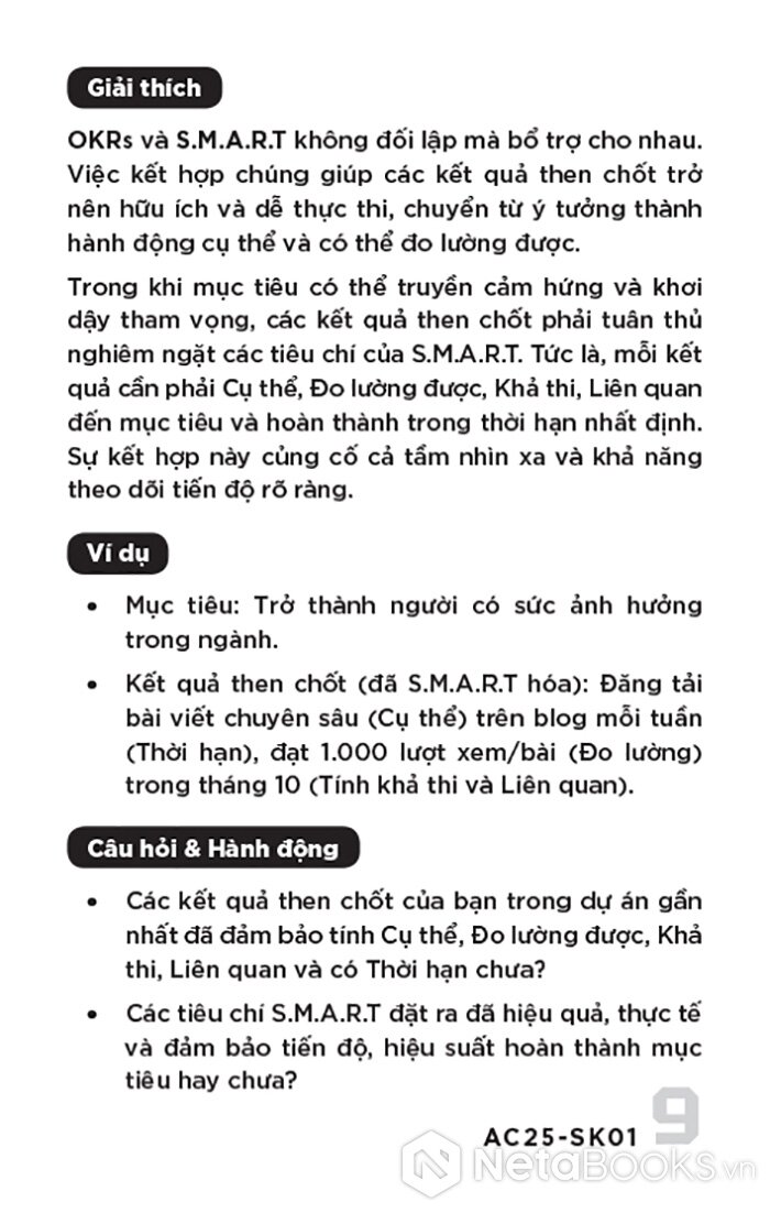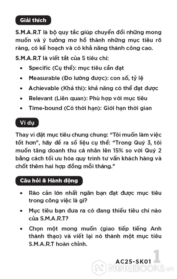 Nỗ lực nhưng vẫn lạc hướng? Vấn đề không nằm ở sự chăm chỉ mà là thiếu mục tiêu rõ ràng. Bộ thẻ S.M.A.R.T: Đặt mục tiêu - Theo dõi - Đánh giá được biên soạn dựa trên những lý thuyết vững chắc và hiệu quả như các nguyên tắc quản trị hiệu suất kinh điển của Peter Drucker, cách nghiên cứu định cao về tâm lý học thành công của Angela Duckworth và nhiều nhà khoa học lớn… là công cụ thực chiến giúp bạn làm việc có định hướng, bám sát tiến trình và cải thiện hiệu suất liên tục. Với 48 thẻ cho 48 tuần, hãy từng bước biến mục tiêu trên giáy thành kết quả thực tế và chinh phục thành công của bạn.