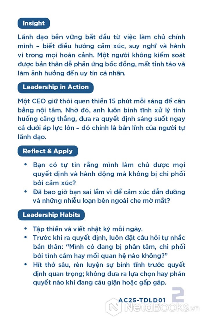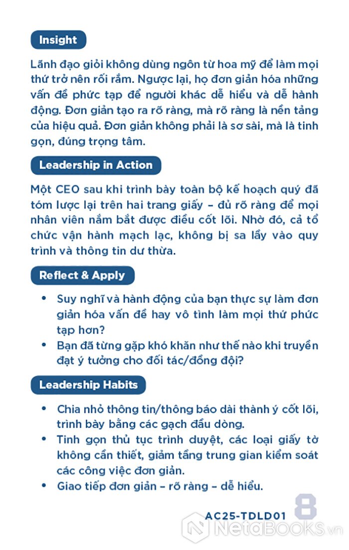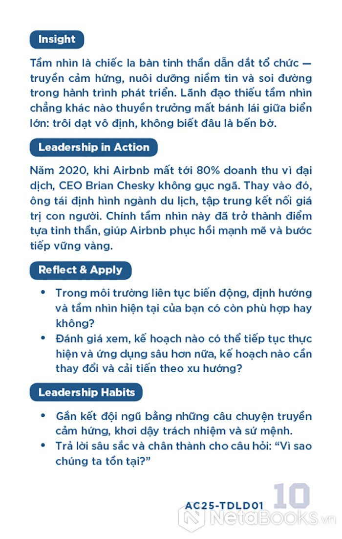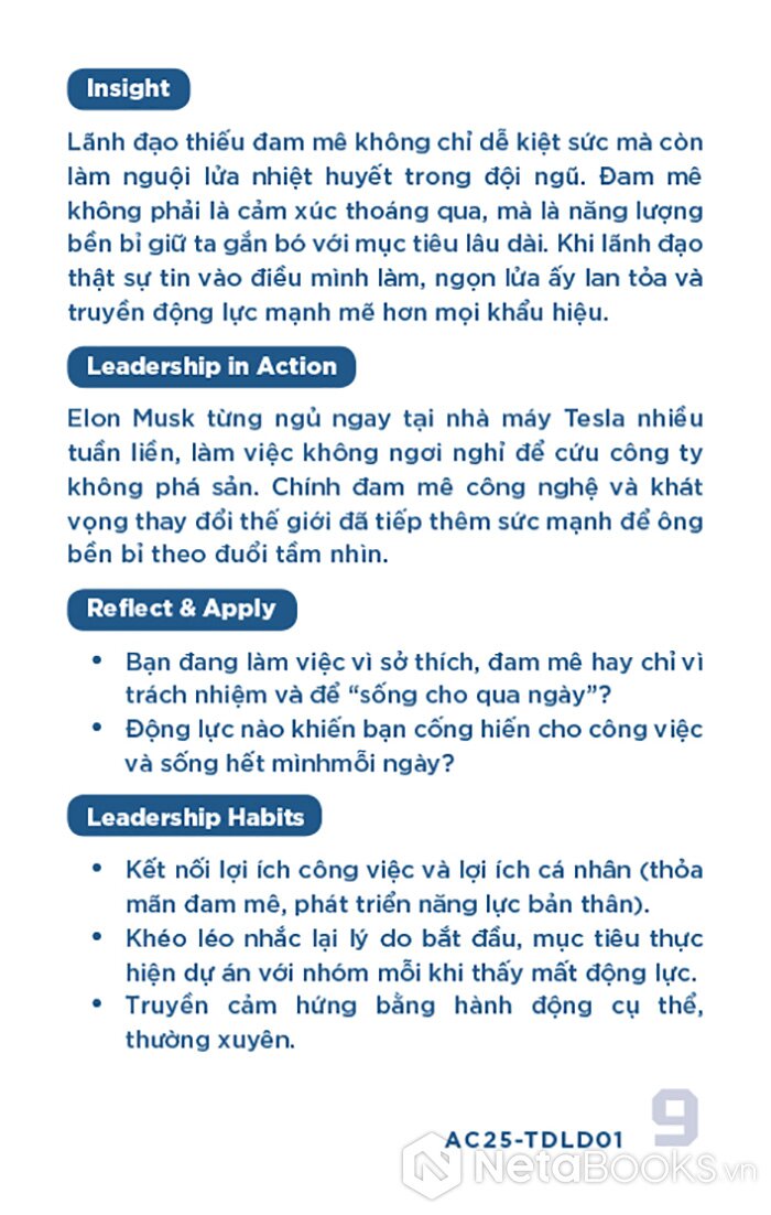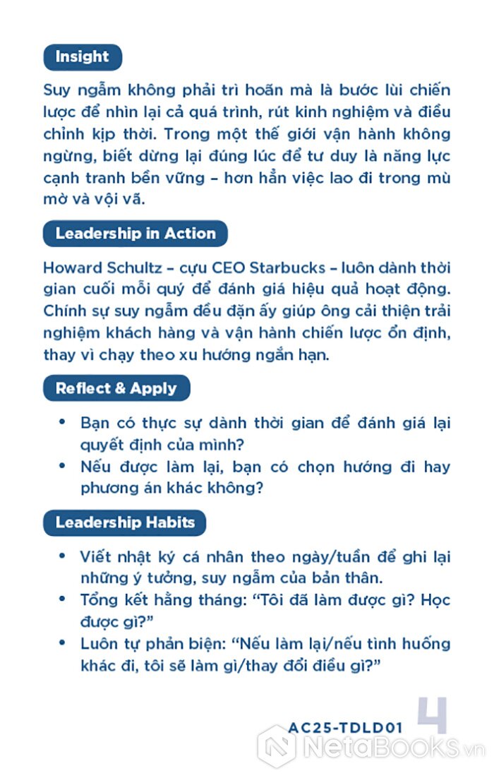 - Mặt sau: Phân tích ngắn gọn (Insight), minh chứng thực tiễn (Leadership in Action), câu hỏi phản tư (Reflect & Apply) và gợi ý hành động cụ thể (Leadership Habits) để áp dụng vào quản lý.