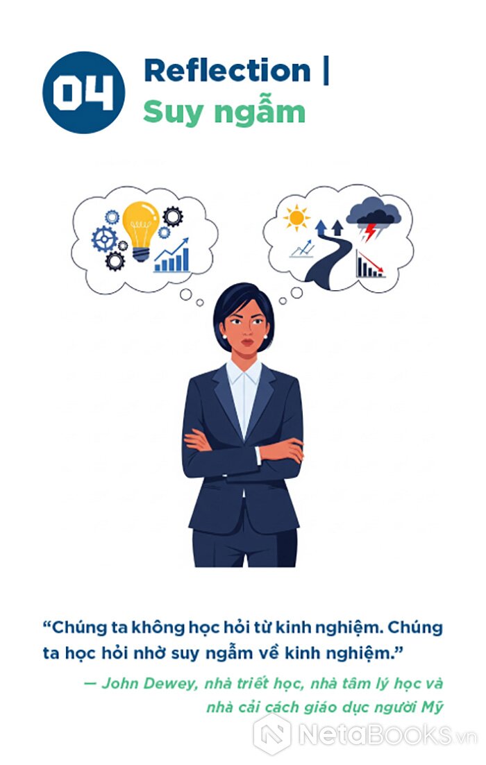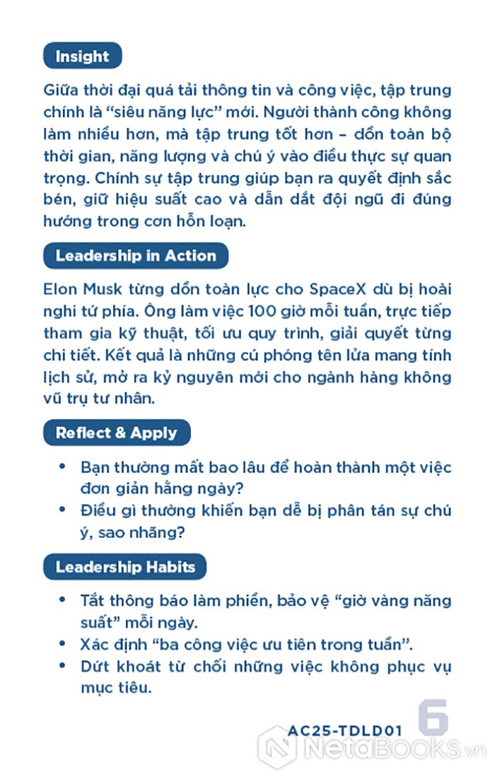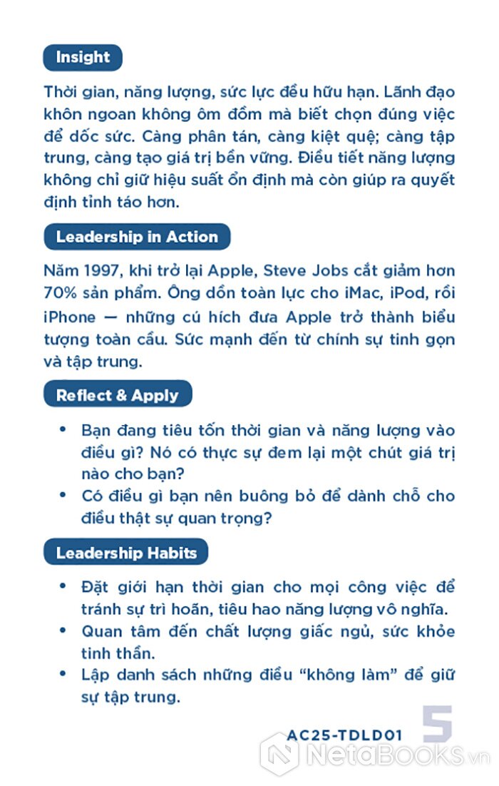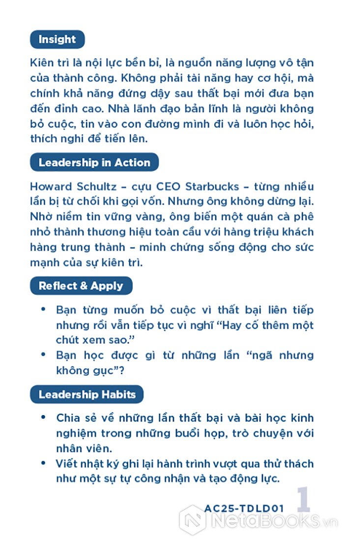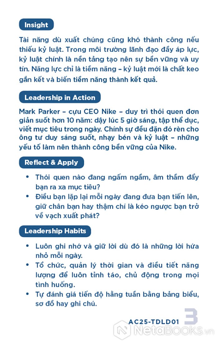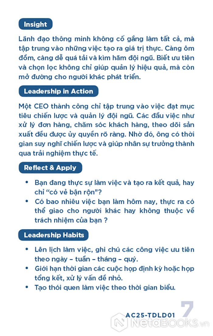 - Mặt sau: Phân tích ngắn gọn (Insight), minh chứng thực tiễn (Leadership in Action), câu hỏi phản tư (Reflect & Apply) và gợi ý hành động cụ thể (Leadership Habits) để áp dụng vào quản lý.