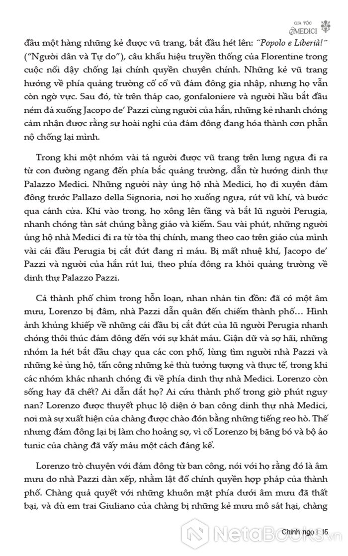 Cuốn sách bắt đầu từ những bước đi đầu tiên của gia tộc Medici, khi họ vẫn chỉ là một gia đình bình thường nhưng nhanh chóng vươn lên nhờ sự nhạy bén trong kinh doanh ngân hàng. Từ nền tảng tài chính vững chắc, họ dần xây dựng ảnh hưởng chính trị sâu rộng, từng bước kiểm soát Florence và biến nơi đây thành trung tâm quyền lực của mình. Qua từng thế hệ, đặc biệt dưới sự lãnh đạo của những nhân vật kiệt xuất như Cosimo hay Lorenzo, Medici không chỉ củng cố vị thế chính trị mà còn trở thành những người bảo trợ vĩ đại cho nghệ thuật, khoa học và triết học, góp phần quan trọng vào sự phát triển của chủ nghĩa nhân văn và văn minh Phục Hưng.