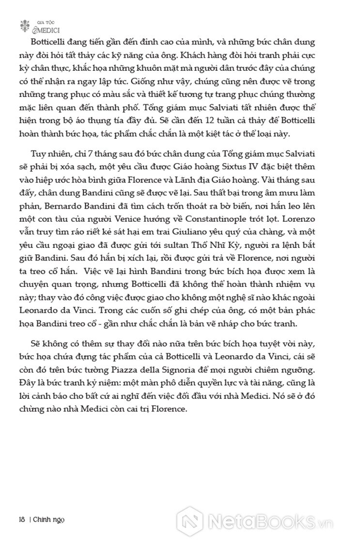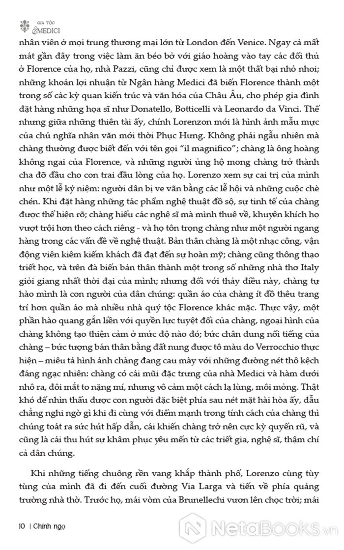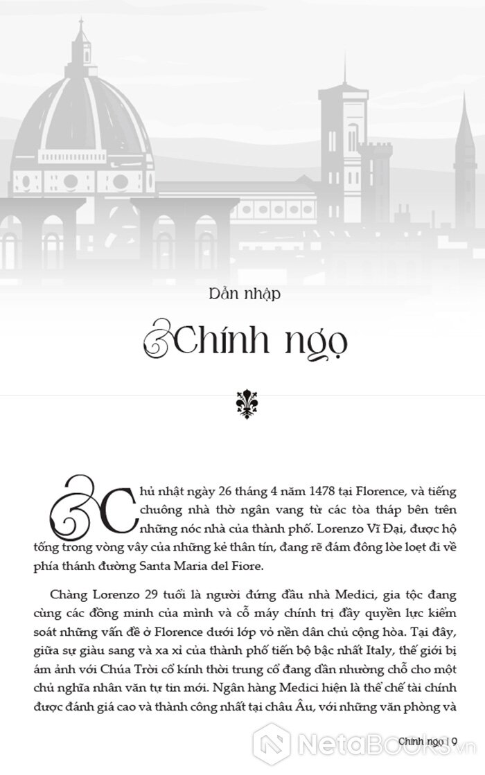 Điểm đặc biệt của cuốn sách nằm ở chỗ nó không chỉ dừng lại ở việc kể lại các sự kiện lịch sử, mà còn khắc họa rõ nét bức tranh trí tuệ của thời đại: sự trỗi dậy của chủ nghĩa nhân văn, vai trò của các thiên tài nghệ thuật như Michelangelo hay Leonardo da Vinci dưới sự bảo trợ của Medici, cũng như sự hình thành của tư duy khoa học hiện đại gắn với những nhân vật như Galileo. Tất cả tạo nên một câu chuyện vừa giàu tính lịch sử, vừa sâu sắc về văn hóa và tư tưởng.