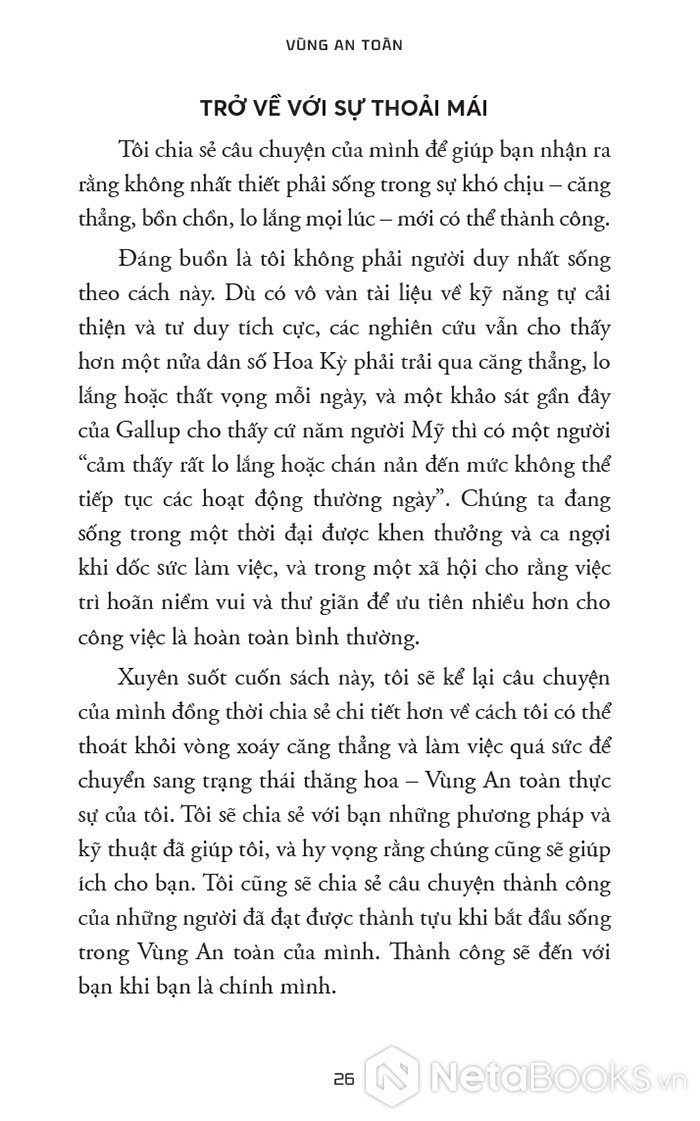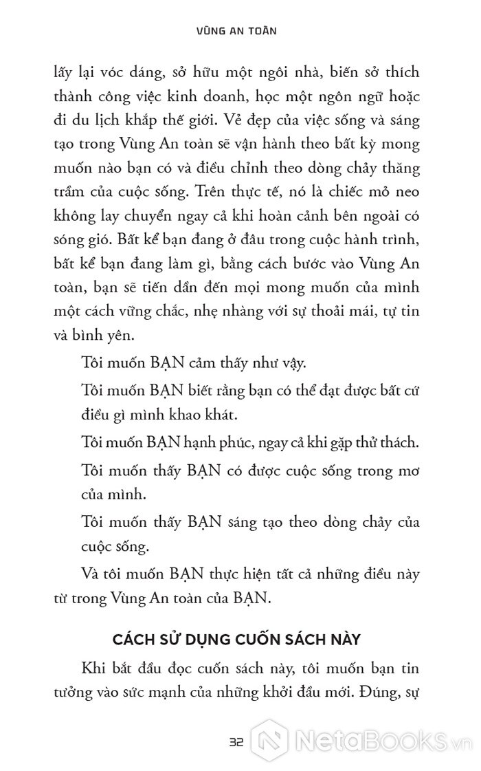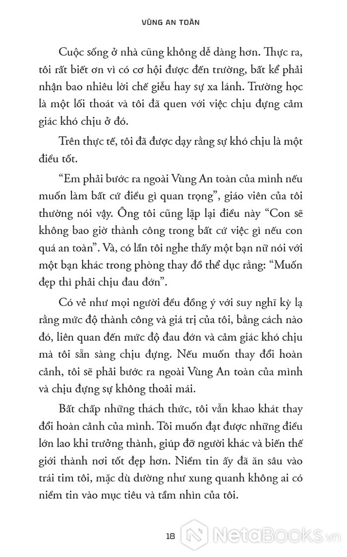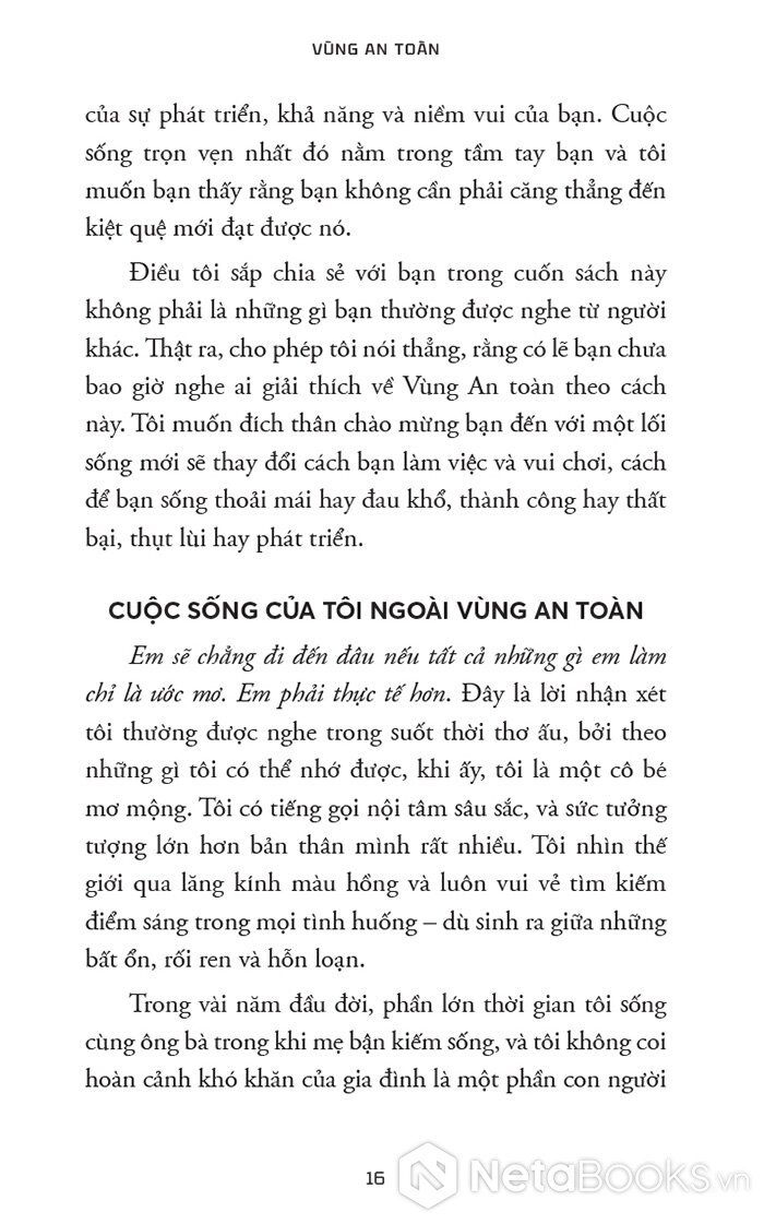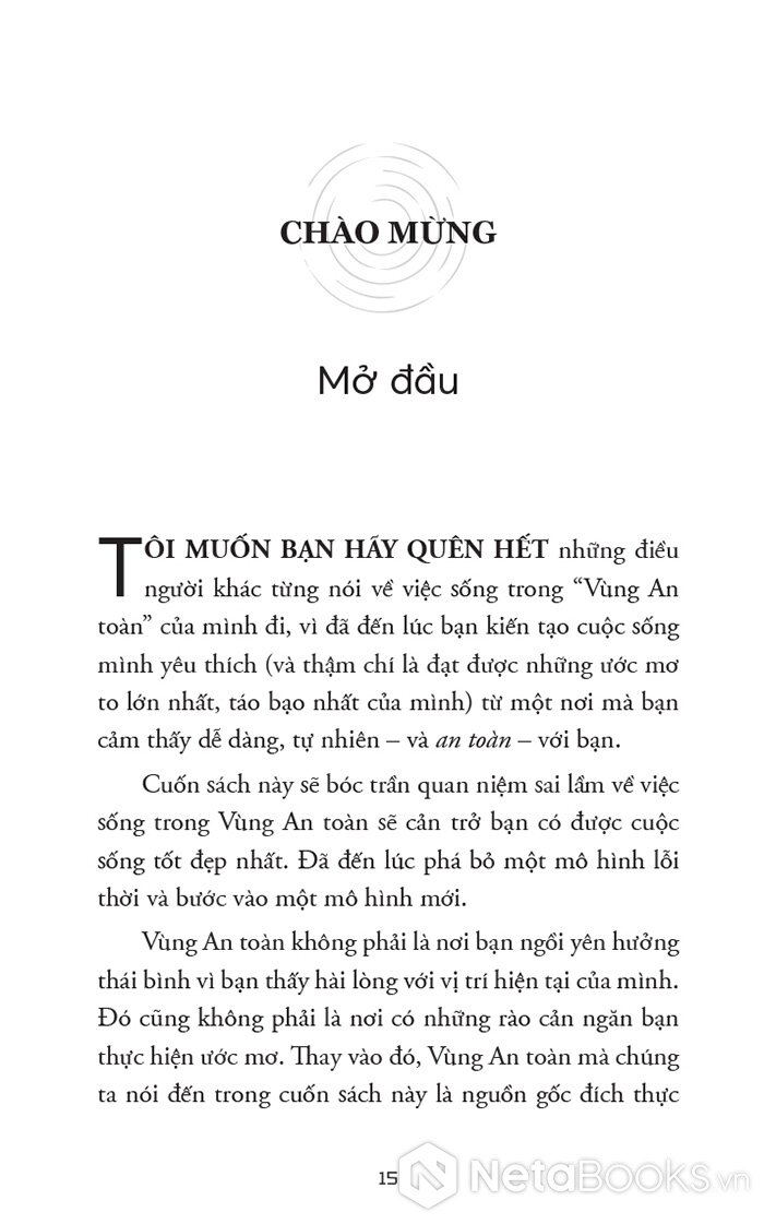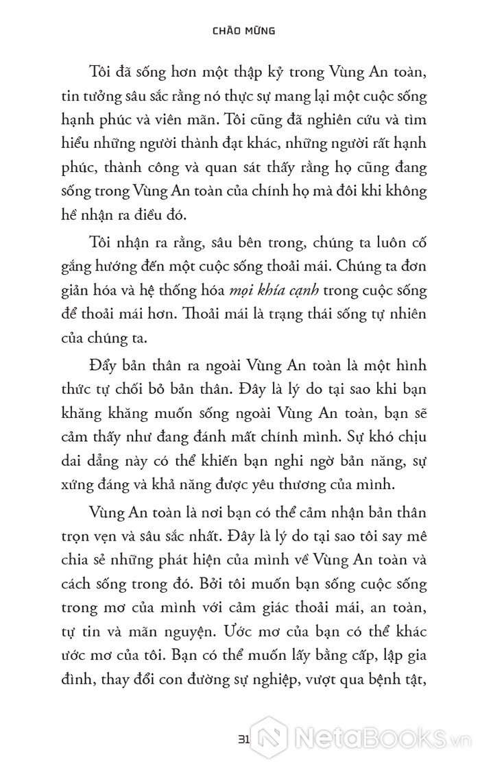 “Vùng An toàn không phải là nơi bạn ngồi yên hưởng thái bình vì bạn thấy hài lòng với vị trí hiện tại của mình. Đó cũng không phải là nơi có những rào cản ngăn bạn thực hiện ước mơ. Thay vào đó, Vùng An toàn mà chúng ta nói đến trong cuốn sách này là nguồn gốc đích thực của sự phát triển, khả năng và niềm vui của bạn.”