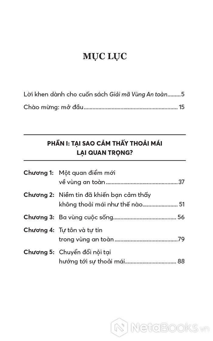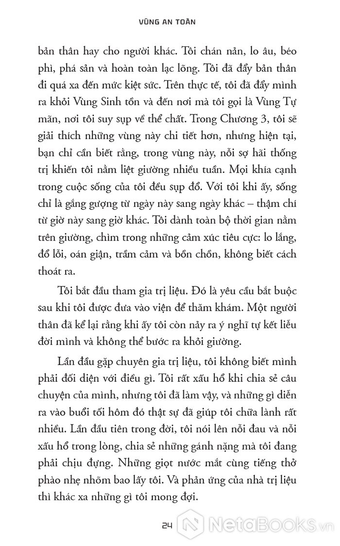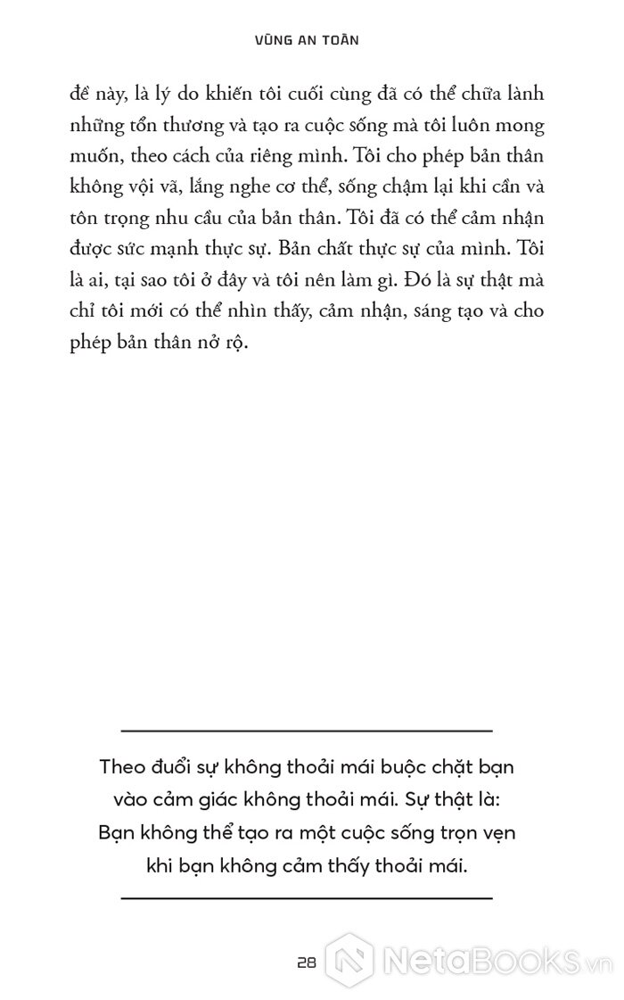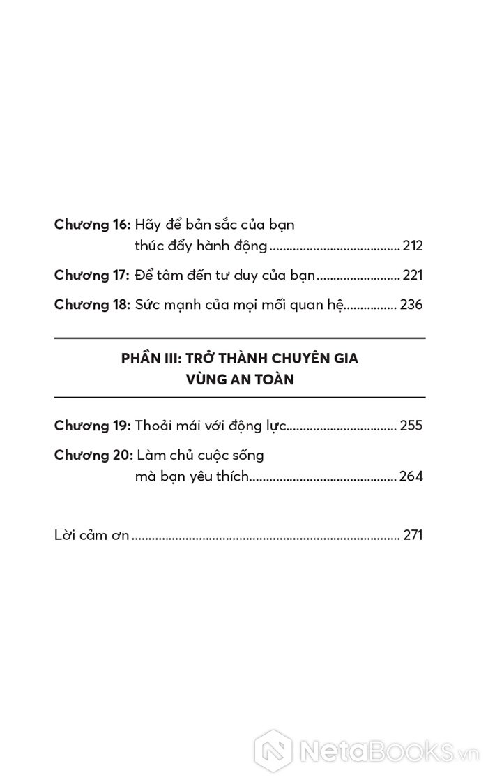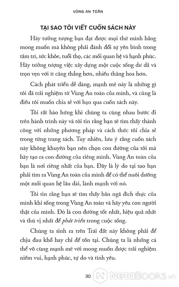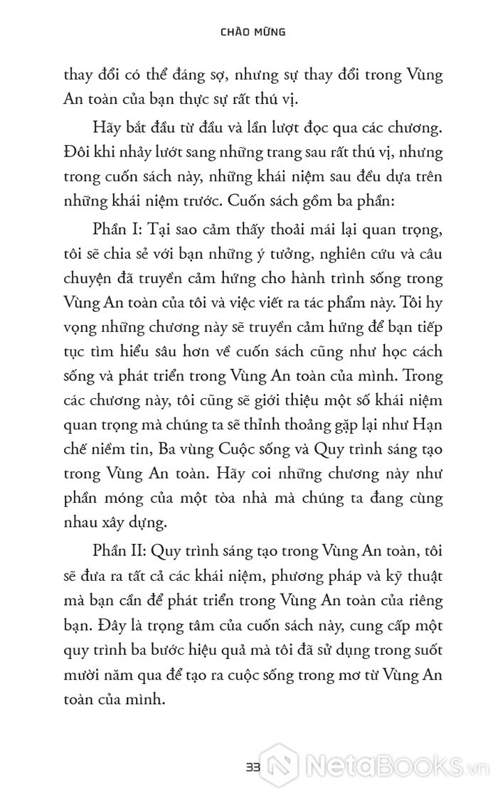 “Vùng An toàn không phải là nơi bạn ngồi yên hưởng thái bình vì bạn thấy hài lòng với vị trí hiện tại của mình. Đó cũng không phải là nơi có những rào cản ngăn bạn thực hiện ước mơ. Thay vào đó, Vùng An toàn mà chúng ta nói đến trong cuốn sách này là nguồn gốc đích thực của sự phát triển, khả năng và niềm vui của bạn.”