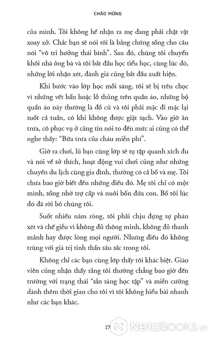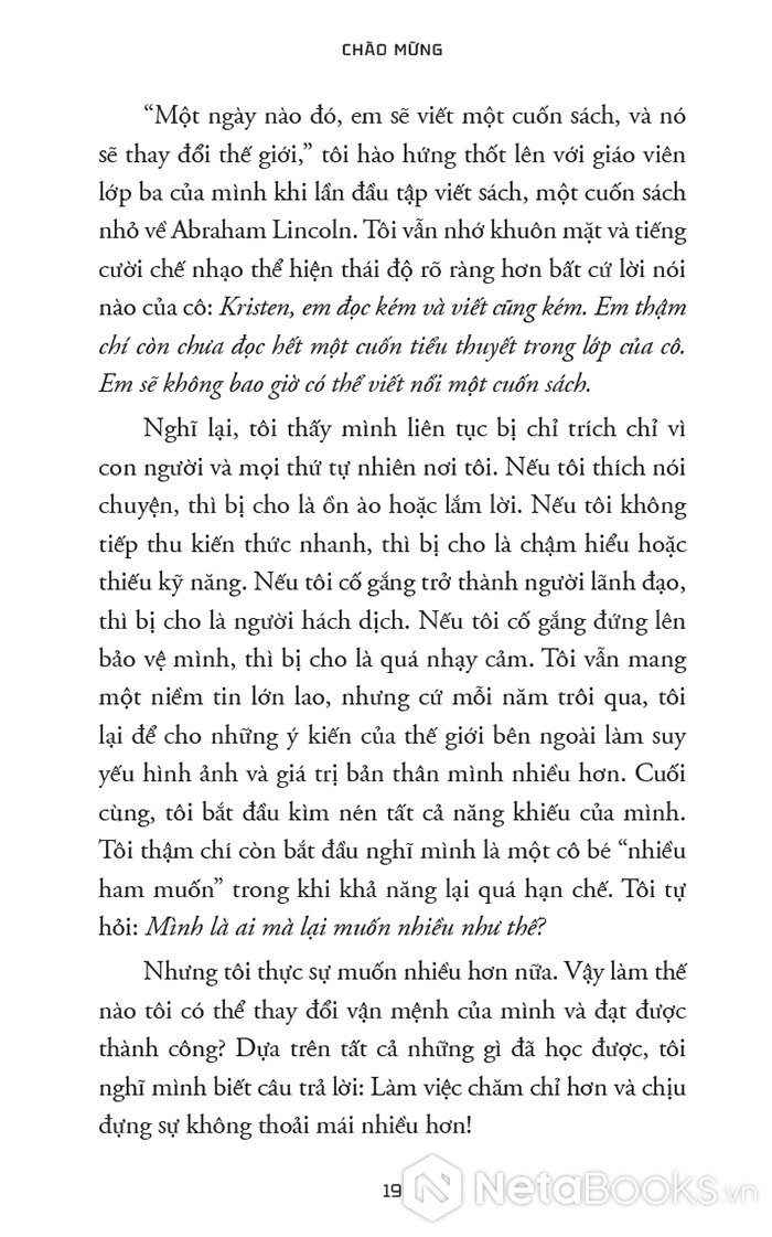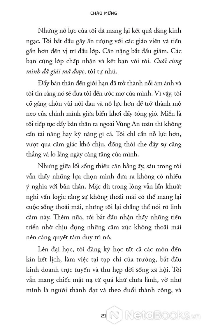 Tác giả mở đầu bằng việc giải cấu trúc những niềm tin phổ biến: “phải chịu đựng mới thành công”, “phải bước ra khỏi nơi thoải mái”. Phần này giàu trải nghiệm cá nhân, tạo nền tảng cảm xúc mạnh, đồng thời xây dựng các khái niệm cốt lõi như: