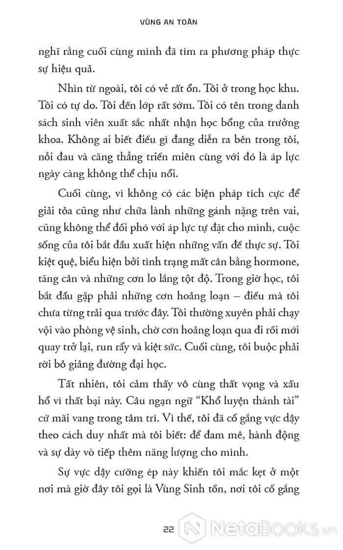 “Khi không tin tưởng vào bản thân, bạn sẽ cảm thấy mất kết nối, bối rối và bất an – tất cả những trạng thái này làm xói mòn sự tự tin của bạn. Khi thường xuyên sống bên ngoài Vùng An toàn, bạn sẽ tạo ra một vòng lặp vô tận của những cảm xúc tiêu cực khiến lòng tự tôn và niềm tin của bạn bị phá vỡ.”