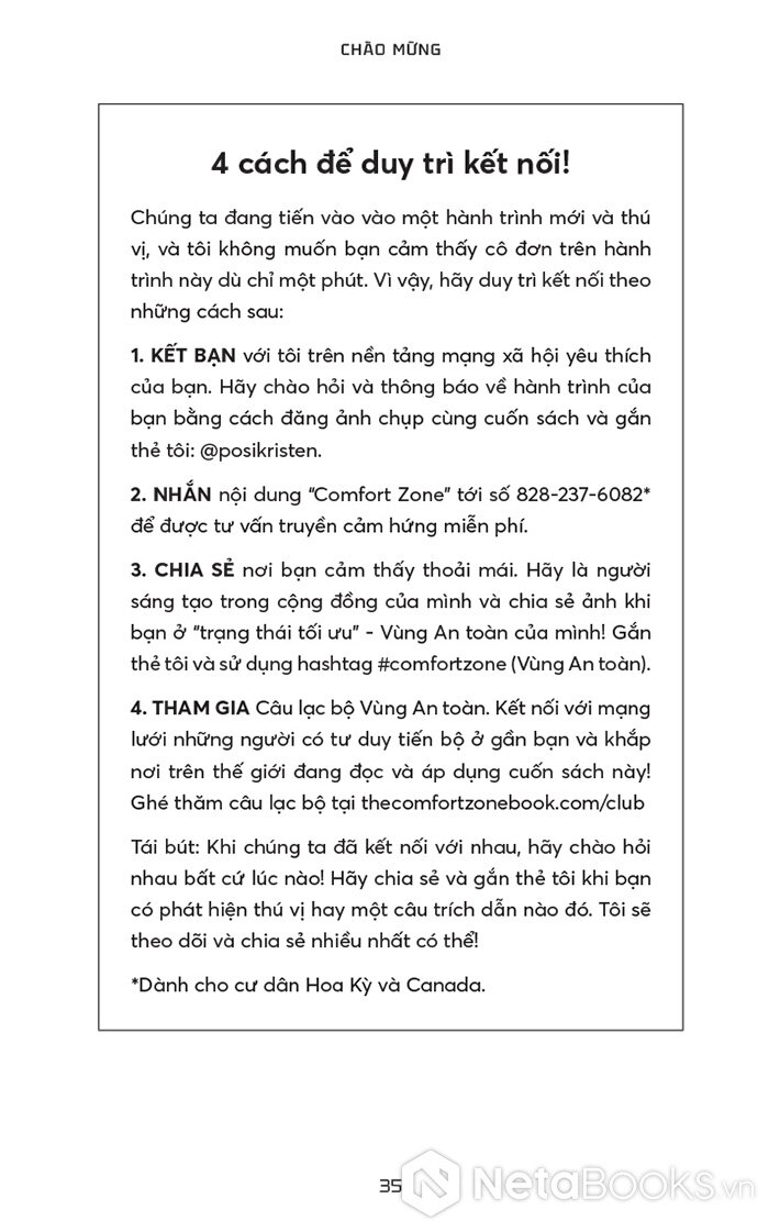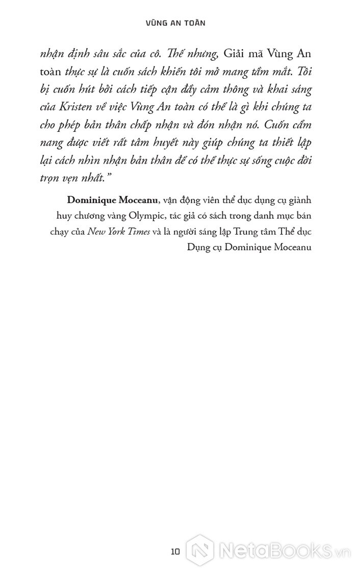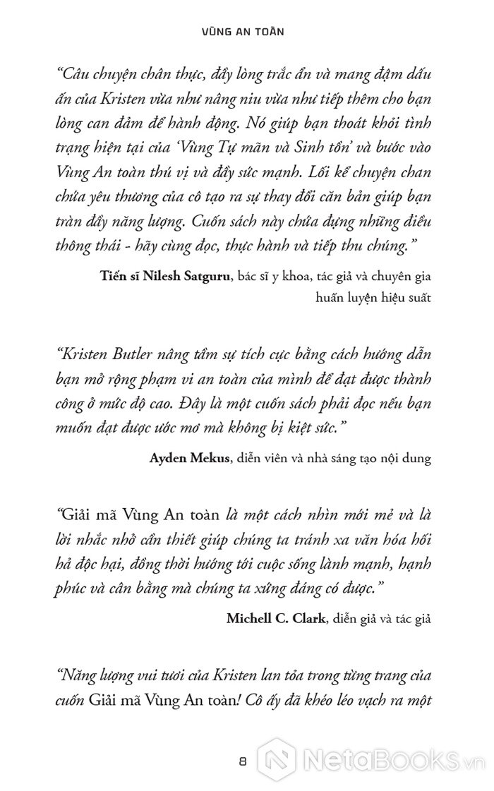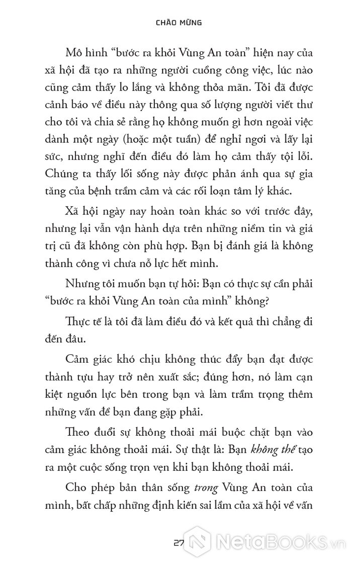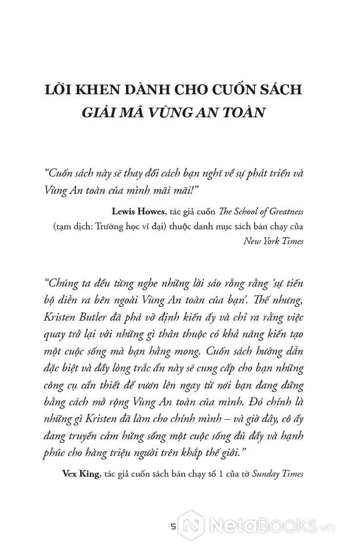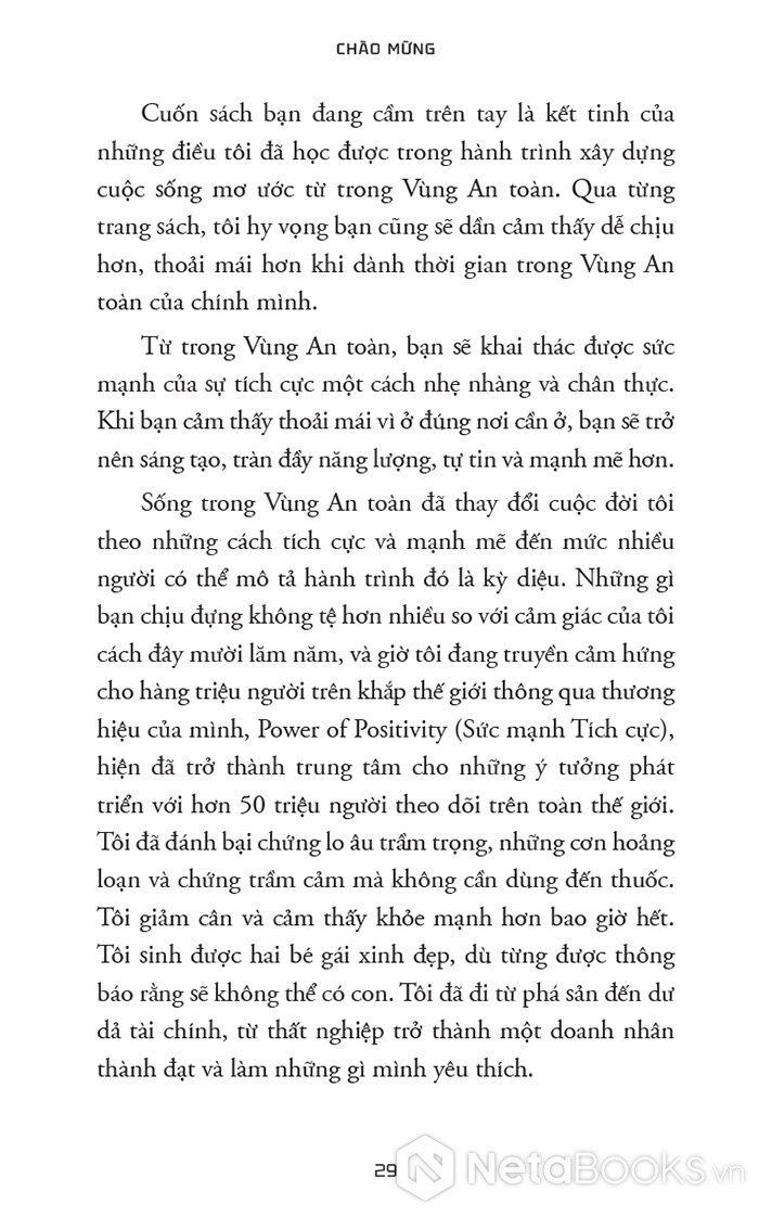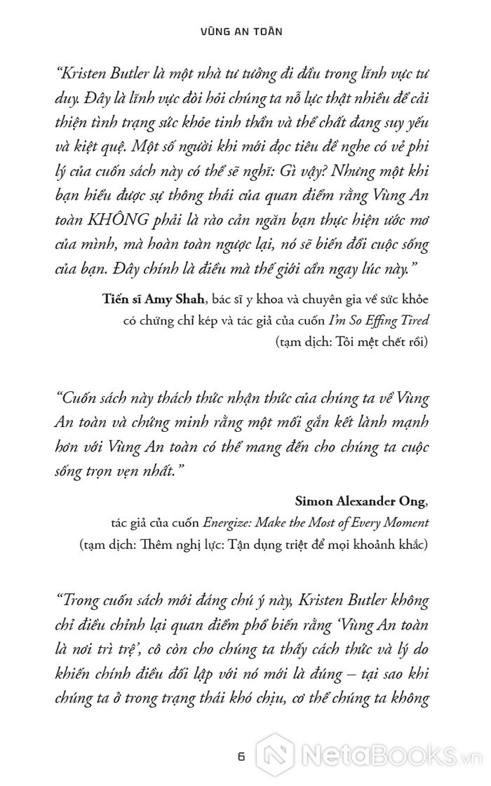 “Tôi muốn bạn hãy quên hết những điều người khác từng nói về việc sống trong ‘Vùng An toàn’ của mình đi, vì đã đến lúc bạn kiến tạo cuộc sống mình yêu thích (và thậm chí là đạt được những ước mơ to lớn nhất, táo bạo nhất của mình) từ một nơi mà bạn cảm thấy dễ dàng, tự nhiên – và an toàn – với bạn. Cuốn sách này sẽ bóc trần quan niệm sai lầm về việc sống trong Vùng An toàn sẽ cản trở bạn có được cuộc sống tốt đẹp nhất. Đã đến lúc phá bỏ một mô hình lỗi thời và bước vào một mô hình mới.”