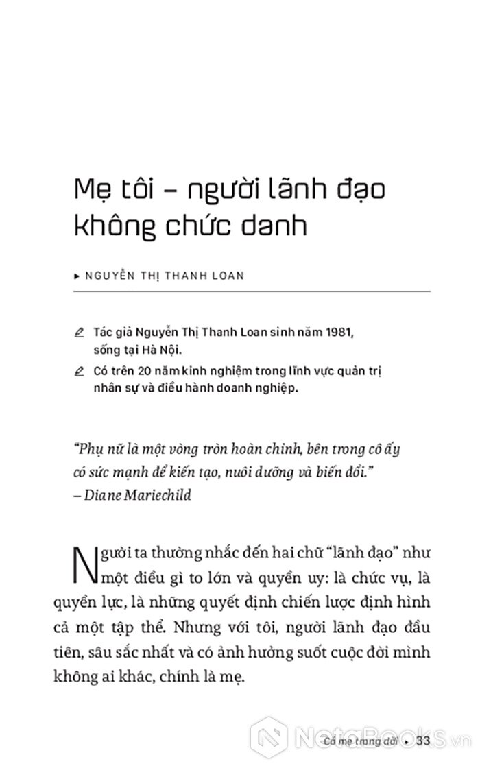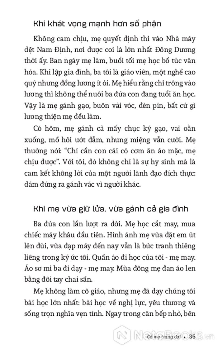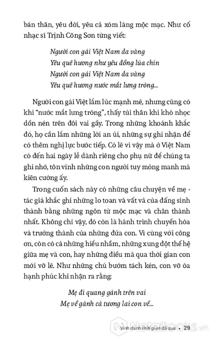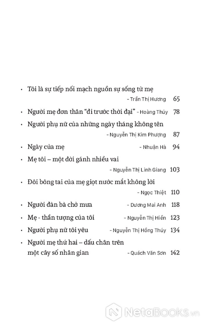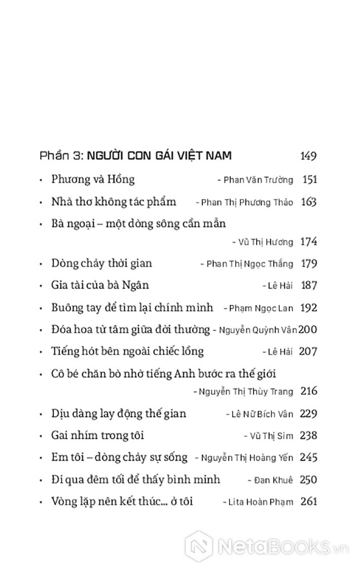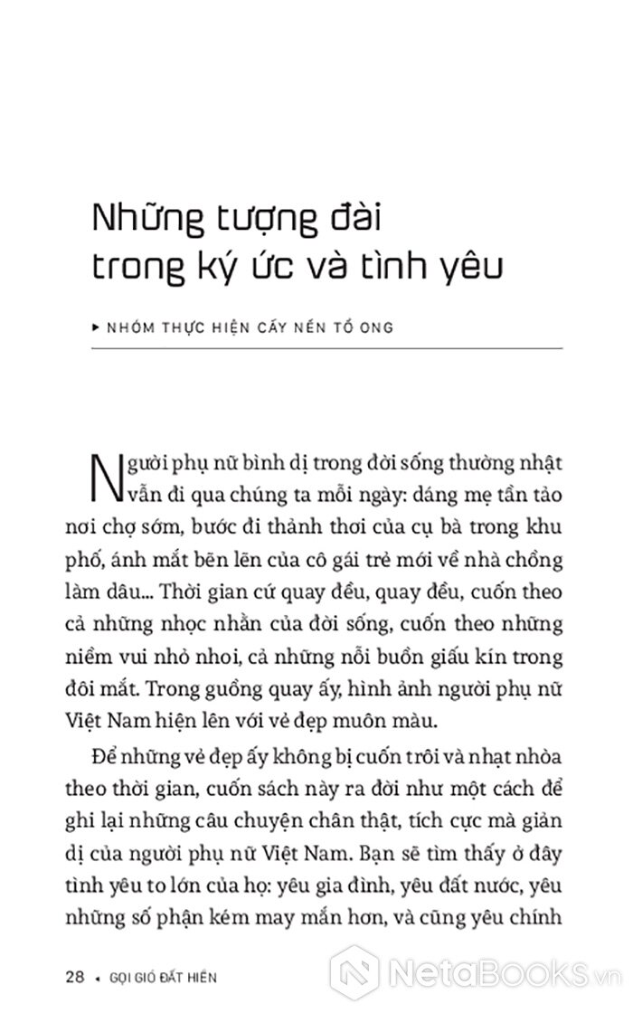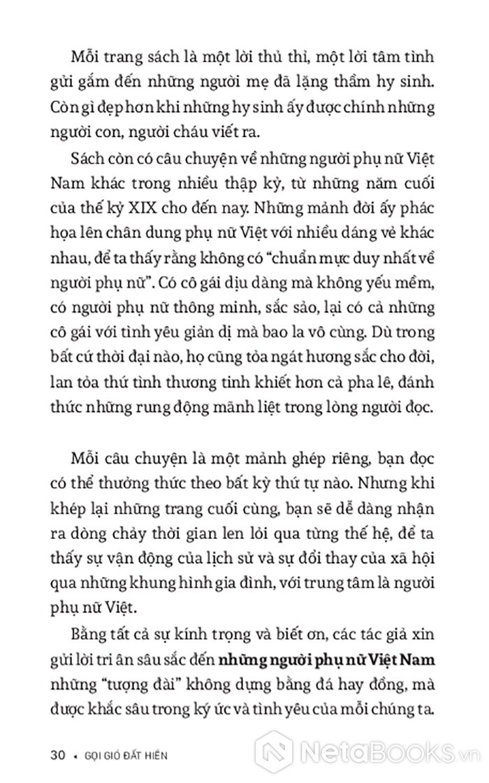 Để những vẻ đẹp ấy không bị cuốn trôi và nhạt nhòa theo thời gian, cuốn sách này ra đời như một cách để ghi lại những câu chuyện chân thật, tích cực mà giản dị của người phụ nữ Việt Nam. Bạn sẽ tìm thấy ở đây tình yêu to lớn của họ: yêu gia đình, yêu đất nước, yêu những số phận kém may mắn hơn, và cũng yêu chính bản thân, yêu đời, yêu cả xóm làng mộc mạc.