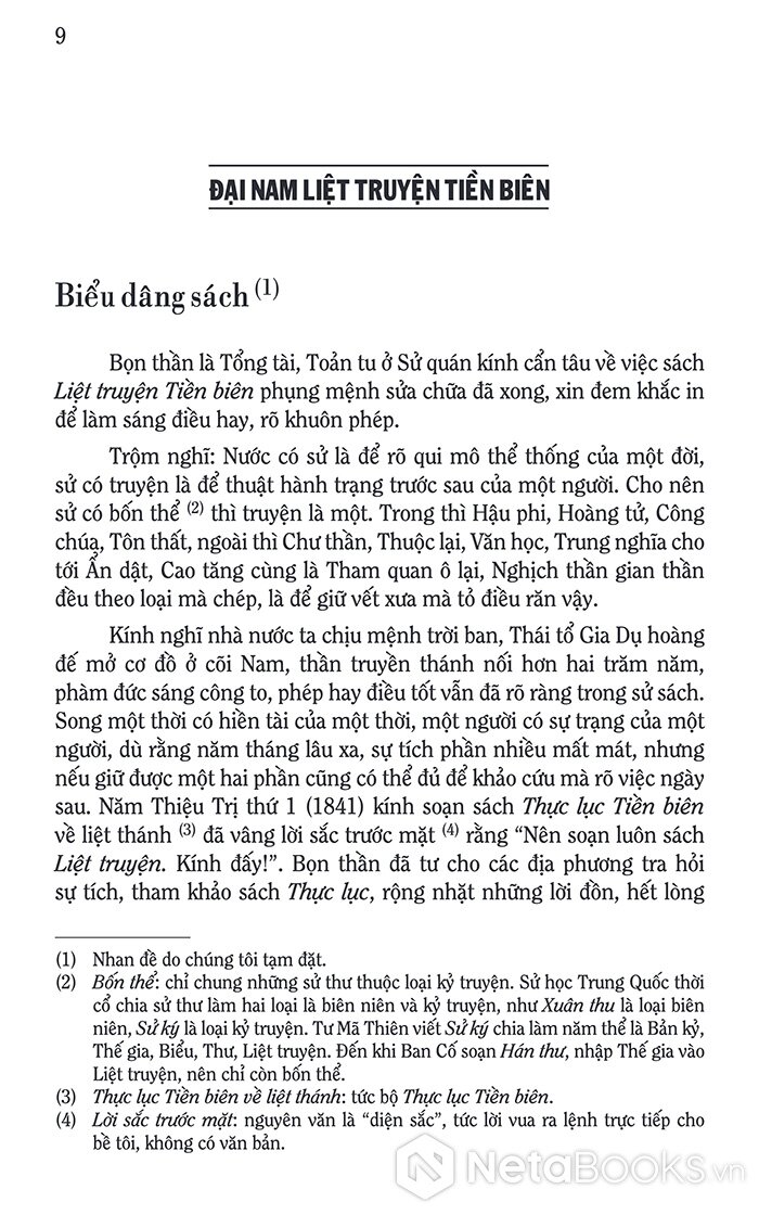 Đại Nam Liệt truyện Tiền biên (in năm 1852), ghi chép sự tích, công trạng của khoảng 300 nhân vật lịch sử Đàng Trong, được biên soạn trong bối cảnh nhà Nguyễn đã thống nhất giang sơn, xác lập chủ quyền và hệ thống chính trị ổn định trên toàn lãnh thổ đất nước. Bởi vậy, việc dựng lại gốc nguồn, truy nguyên công đức tổ tiên và ghi chép hành trạng các bậc tiền nhân không chỉ là hoạt động sử học, mà còn là việc khẳng định sự chính danh của triều đại. Với quan điểm “sử để răn, để soi” cùng lối văn ngắn gọn, sáng sủa, Quốc sử quán triều Nguyễn đã tạo nên một tác phẩm có giá trị lịch sử, văn hoá, khoa học.