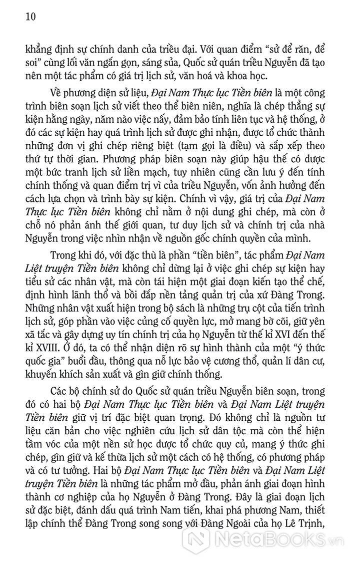 Các bộ chính sử do Quốc sử quán triều Nguyễn biên soạn, trong đó có hai bộ Đại Nam Thực lục Tiền biên và Đại Nam Liệt truyện Tiền biên giữ vị trí đặc biệt quan trọng. Không chỉ là nguồn tư liệu căn bản cho việc nghiên cứu lịch sử dân tộc, chúng còn thể hiện tầm vóc của một nền sử học được tổ chức quy củ, mang ý thức ghi chép, gìn giữ và truyền thừa lịch sử một cách có hệ thống, có phương pháp và có tư tưởng. Hai bộ Đại Nam Thực lục Tiền biên và Đại Nam Liệt truyện Tiền biên là những tác phẩm mở đầu, phản ánh giai đoạn hình thành cơ nghiệp của họ Nguyễn ở Đàng Trong. Đây là giai đoạn lịch sử đặc biệt, đánh dấu quá trình Nam tiến, khai phá phương Nam, thiết lập chính thể Đàng Trong song song với Đàng Ngoài của họ Lê Trịnh, đồng thời là thời kỳ phát triển rực rỡ về kinh tế, quân sự và văn hóa. Những biến động, thăng trầm, công cuộc mở đất cùng hệ thống chính trị - xã hội của Đàng Trong được phản ánh trong hai bộ chính sử này một cách sinh động và có chiều sâu, giúp người đọc hôm nay hiểu rõ hơn về một phần không thể tách rời của lịch sử Việt Nam.