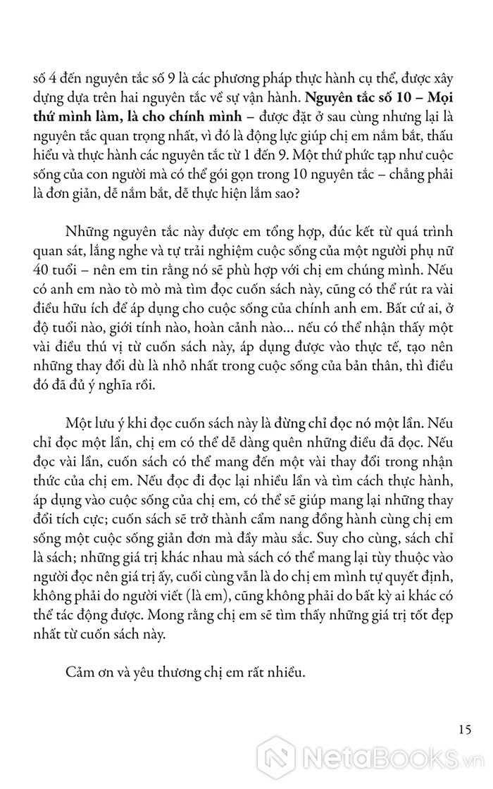 Mỗi chương không chỉ dừng ở phân tích, mà còn kèm theo ví dụ thực tế và gợi ý thực hành. Cuốn sách giống như một người bạn đồng hành, nhắc nhở ta yêu thương bản thân, biết ơn những điều giản dị và giữ tâm an trong guồng quay bận rộn. Đây là cuốn sách nhẹ nhàng, gần gũi, nhưng giàu tính ứng dụng cho bất kỳ ai muốn tìm sự đủ đầy từ chính mình.