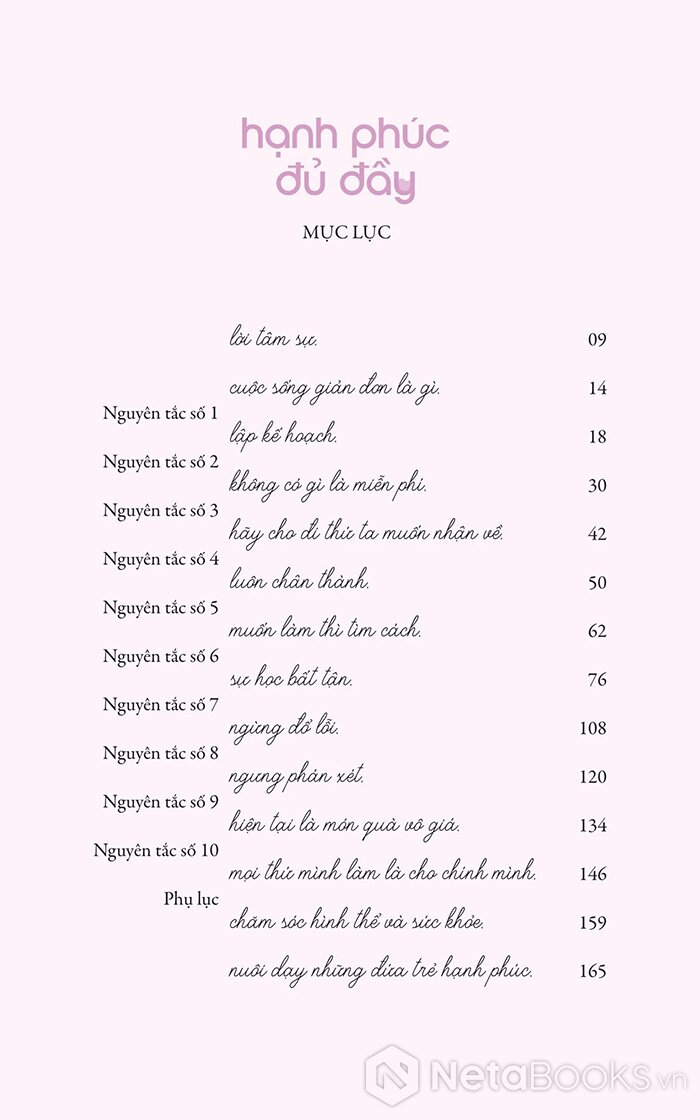 Hạnh Phúc Đủ Đầy đưa ra 10 nguyên tắc giúp con người sống giản đơn mà vẫn tìm thấy sự trọn vẹn trong hạnh phúc. Không phải những triết lý xa vời, mỗi nguyên tắc đều được tác giả Đặng Minh Tâm rút ra từ trải nghiệm cá nhân, quan sát đời sống và sự thấu cảm với phụ nữ hiện đại. Nội dung gồm: Lập kế hoạch, Không có gì miễn phí, Cho đi điều mình muốn nhận lại, Luôn chân thành, Muốn làm thì tìm cách, Sự học bất tận, Ngừng đổ lỗi, Ngưng phán xét, Hiện tại là món quà vô giá, và Mọi thứ mình làm là cho chính mình.