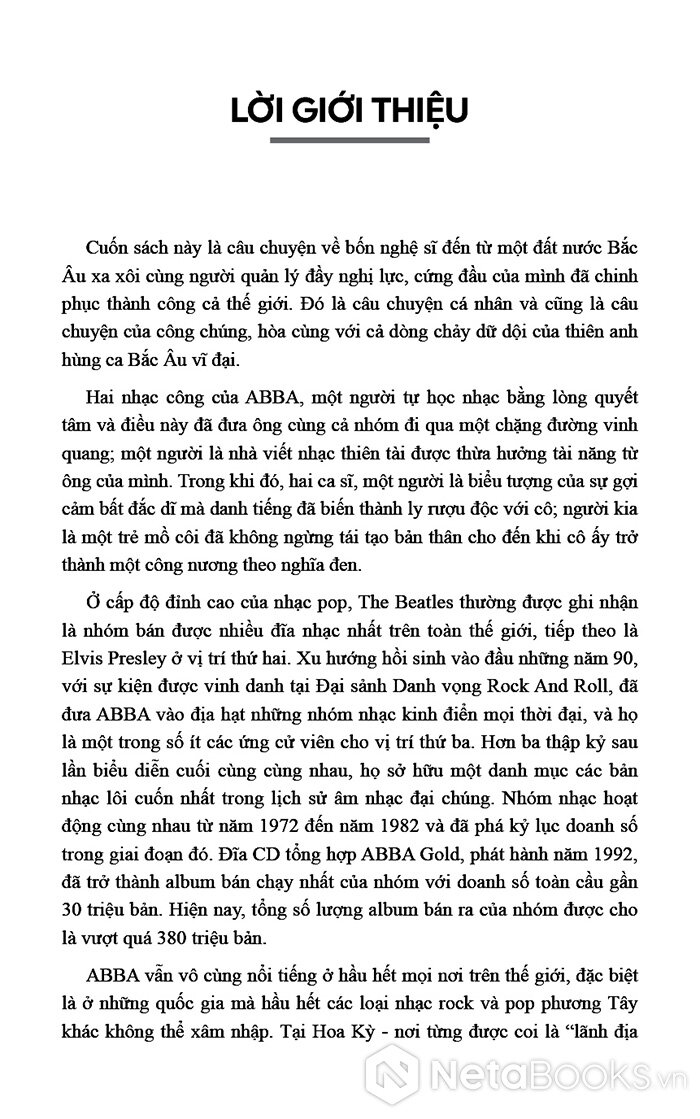 Cuốn sách này là câu chuyện về bốn nghệ sĩ đến từ một đất nước Bắc Âu xa xôi cùng người quản lý đầy nghị lực, cứng đầu của mình đã chinh phục thành công cả thế giới. Đó là câu chuyện cá nhân và cũng là câu chuyện của công chúng, hòa cùng vào dòng chảy dữ dội của thiên anh hùng ca Bắc Âu vĩ đại.