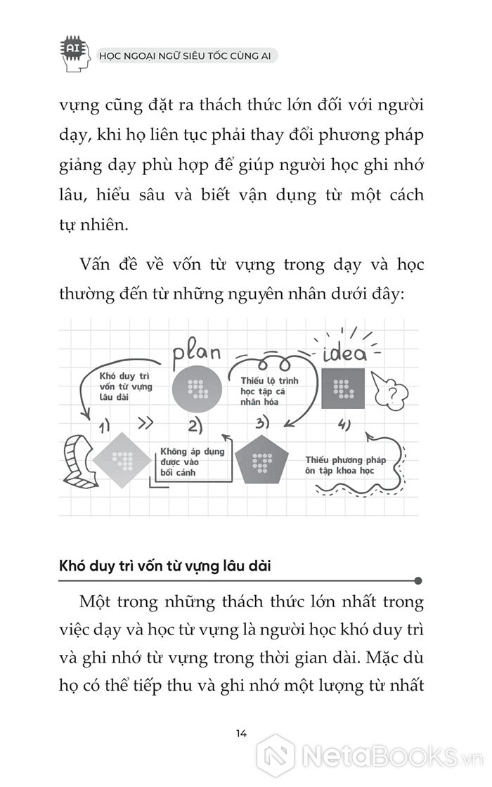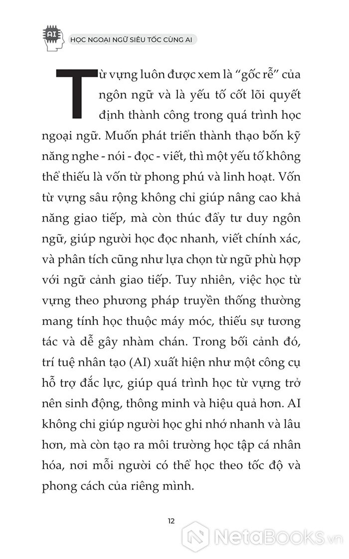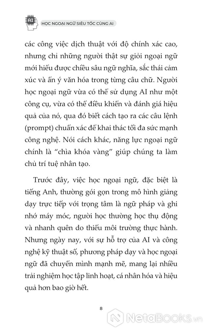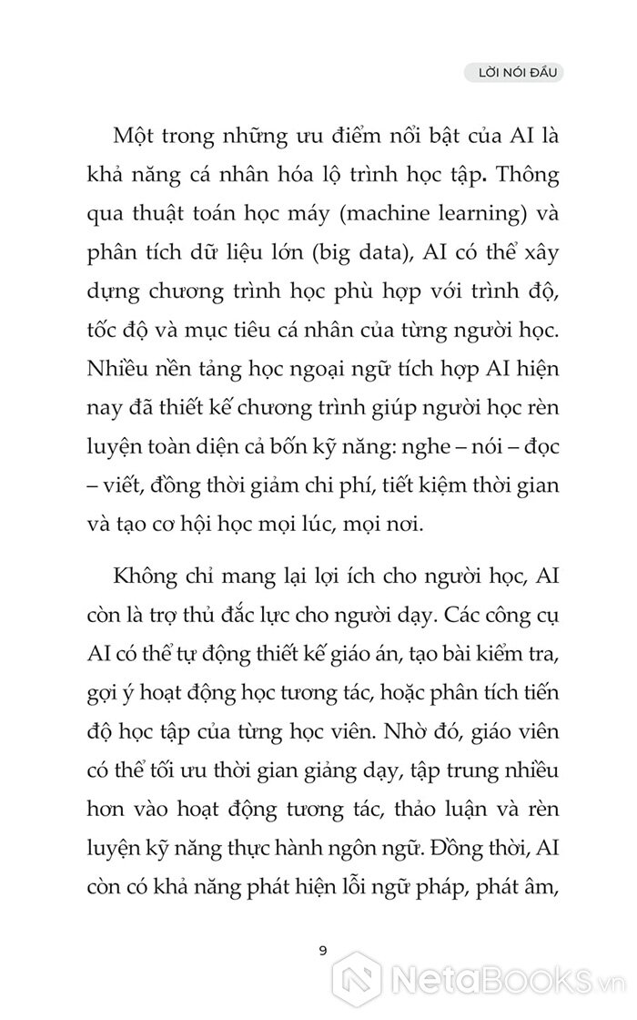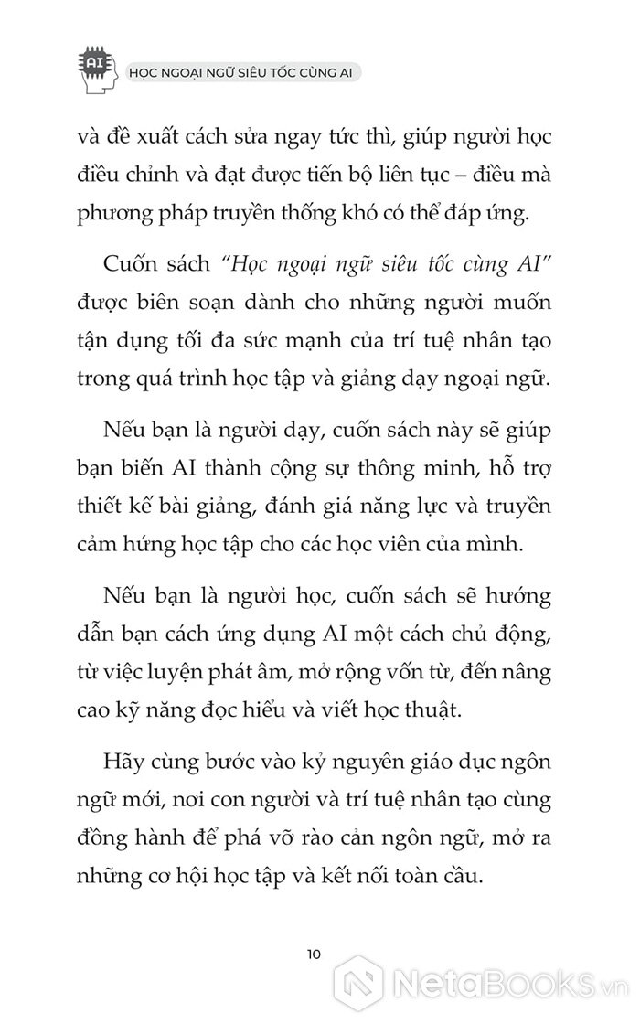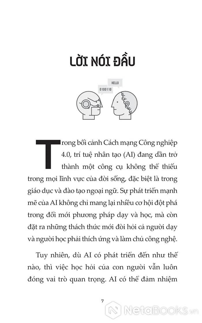 Còn đối với người học, cuốn sách sẽ giúp các bạn hiểu đúng về AI và ứng dụng AI một cách chủ động trong quá trình học ngoại ngữ, từ mở rộng vốn từ tới nâng cao các kỹ năng cơ bản để có thể tự tin và phản xạ ngôn ngữ tự nhiên.