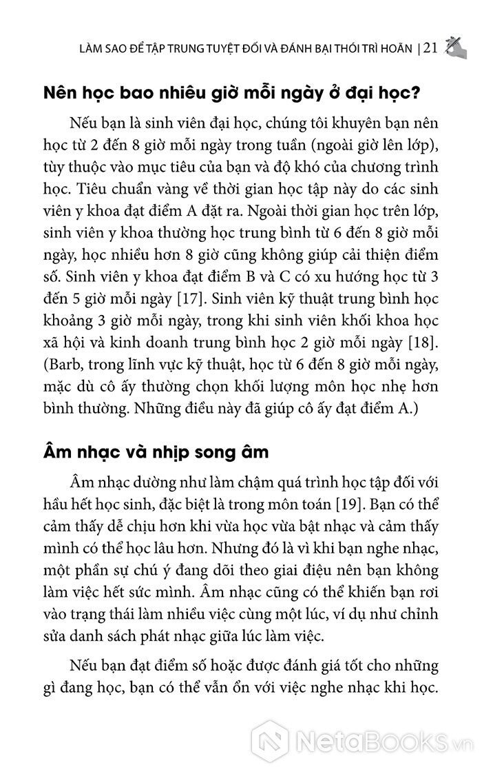 Bạn nên học bao nhiêu giờ mỗi ngày ở đại học? Nếu bạn là sinh viên đại học, chúng tôi khuyên bạn nên học từ 2 đến 8 giờ mỗi ngày trong tuần (ngoài giờ lên lớp), tùy thuộc vào mục tiêu của bạn và độ khó của chương trình học. Tiêu chuẩn vàng về thời gian học tập này do sinh viên y khoa đạt điểm A đặt ra. Ngoài thời gian học trên lớp, sinh viên y khoa thường học trung bình từ 6 đến 8 giờ mỗi ngày, học nhiều hơn 8 giờ cũng không giúp cải thiện điểm số. Sinh viên y khoa đạt điểm B và C có xu hướng học từ 3 đến 5 giờ mỗi ngày. Sinh viên kỹ thuật trung bình học khoảng 3 giờ mỗi ngày, trong khi sinh viên khối khoa học xã hội và kinh doanh trung bình học 2 giờ mỗi ngày. (Barb, trong lĩnh vực kỹ thuật, học từ 6 đến 8 giờ mỗi ngày, mặc dù cô ấy thường chọn khối lượng môn học nhẹ hơn mức trung bình. Những điều này đã giúp cô ấy đạt điểm A).