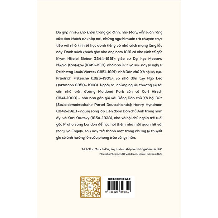 Trong suốt hơn một thế kỷ, hình ảnh Karl Marx thường bị giản lược thành một biểu tượng tư tưởng cứng nhắc hoặc một hệ thống lý thuyết đã hoàn chỉnh. Nhưng cuốn sách Karl Marx và dòng suy tư chưa khép lại - Những năm cuối đời mang đến một chân dung hoàn toàn khác: một Marx đang suy nghĩ, hoài nghi và tiếp tục mở rộng những câu hỏi của mình về thế giới.