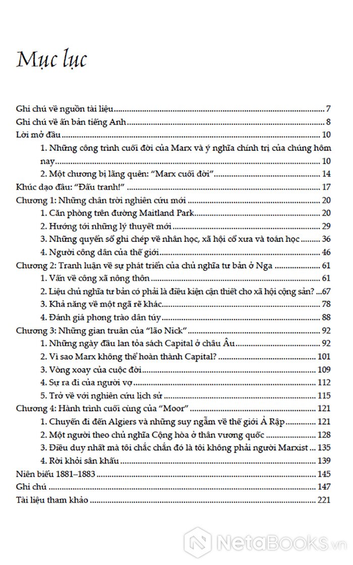 Dựa trên các bản thảo, thư từ và ghi chép nghiên cứu của Marx trong giai đoạn 1881-1883, nhà nghiên cứu Marcello Musto tái dựng một giai đoạn ít được biết đến nhưng cực kỳ quan trọng trong hành trình trí tuệ của ông. Đây là thời điểm Marx, dù đang chịu đựng bệnh tật và những biến cố gia đình, vẫn miệt mài nghiên cứu về nhân học, lịch sử các xã hội tiền tư bản, các nền văn minh ngoài châu Âu và những khả năng khác nhau của con đường phát triển xã hội.
