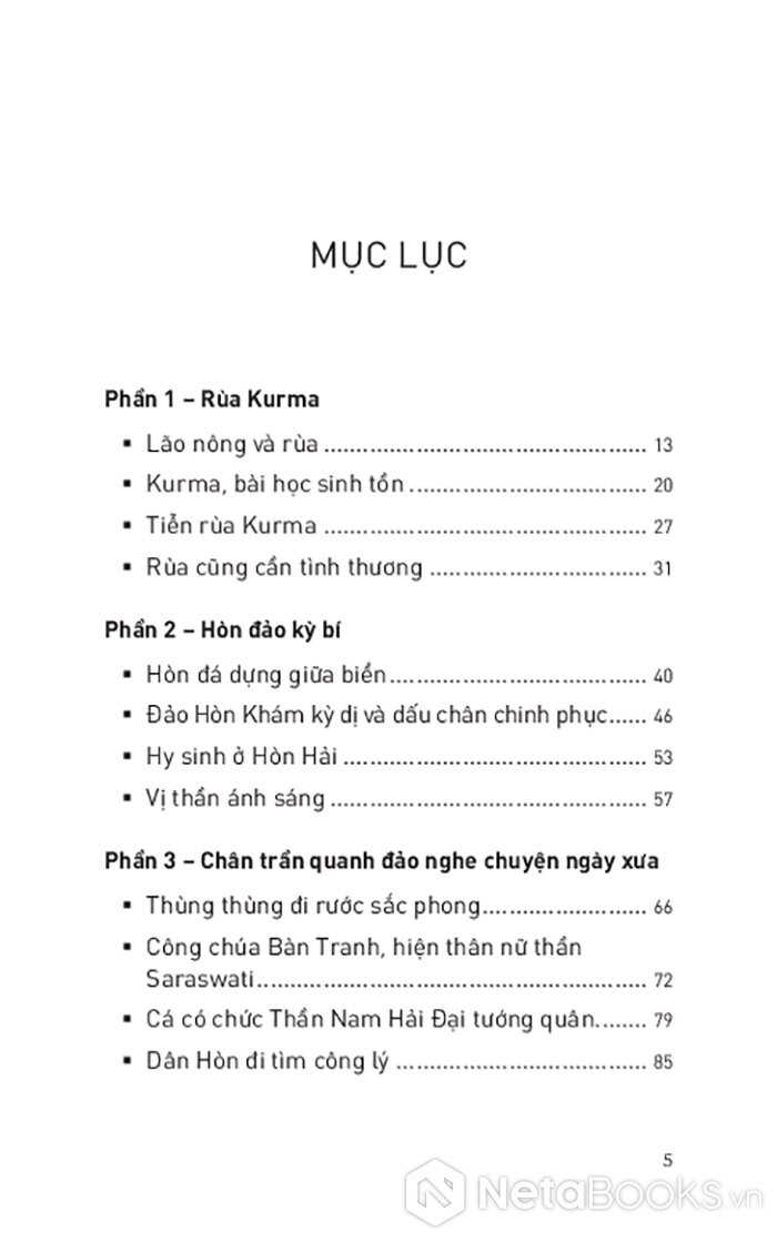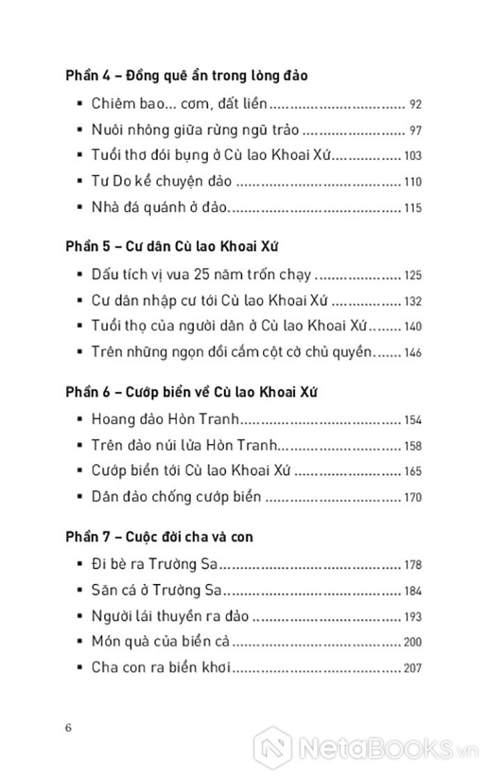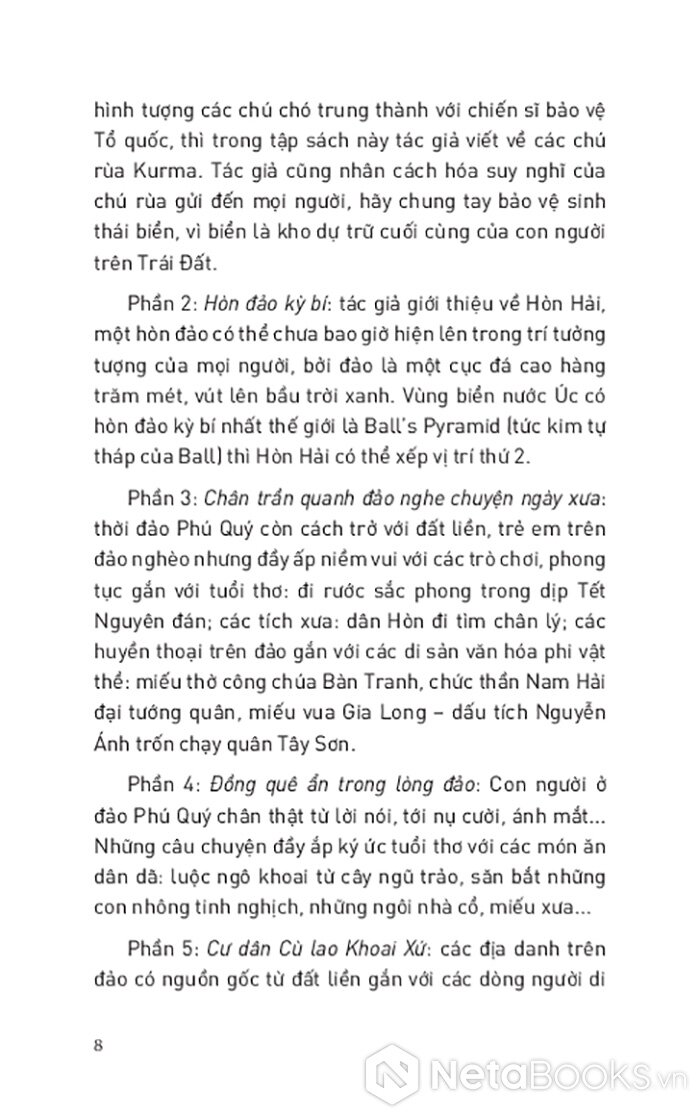 Tập sách có 7 phần: 1: Rùa Kurma, 2: Hòn đảo kỳ bí, 3: Chân trần quanh đảo nghe chuyện ngày xưa, 4: Đồng quê ẩn trong lòng đảo, 5: Cư dân Cù Lao Khoai Xứ; 6: Cướp biển về Cù Lao Khoai Xứ; 7: Cuộc đời cha và con.