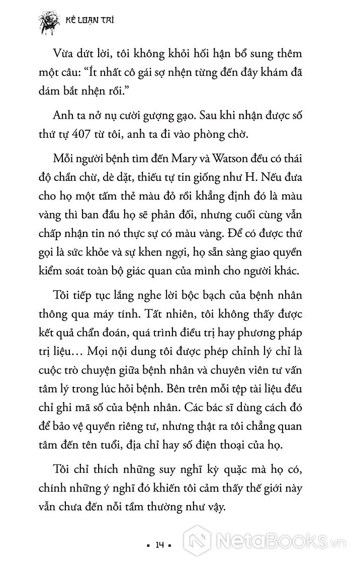 4. Sâu xa hơn, cuốn sách gợi lên suy ngẫm về quyền tự thuật. Khi một người bị chẩn đoán là “tâm thần”, lời nói của họ bỗng mất giá trị, ký ức của họ bị nghi ngờ, cảm xúc của họ bị coi là triệu chứng. Tất cả dấy lên nghi ngờ rằng nếu không ai tin bạn, liệu bạn có đang tồn tại hay không?