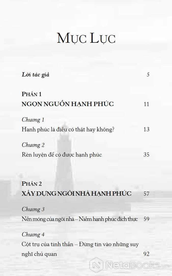 Theo đó, có bảy bước rất đơn giản giúp bạn trải nghiệm niềm hạnh phúc đích thực. Với hình ảnh Ngôi nhà ẩn dụ cho cuộc sống con người, tác giả đã mượn hình ảnh này làm biểu tượng cho ý tưởng của mình: bảy bước để xây dựng “ngôi nhà hạnh phúc”.