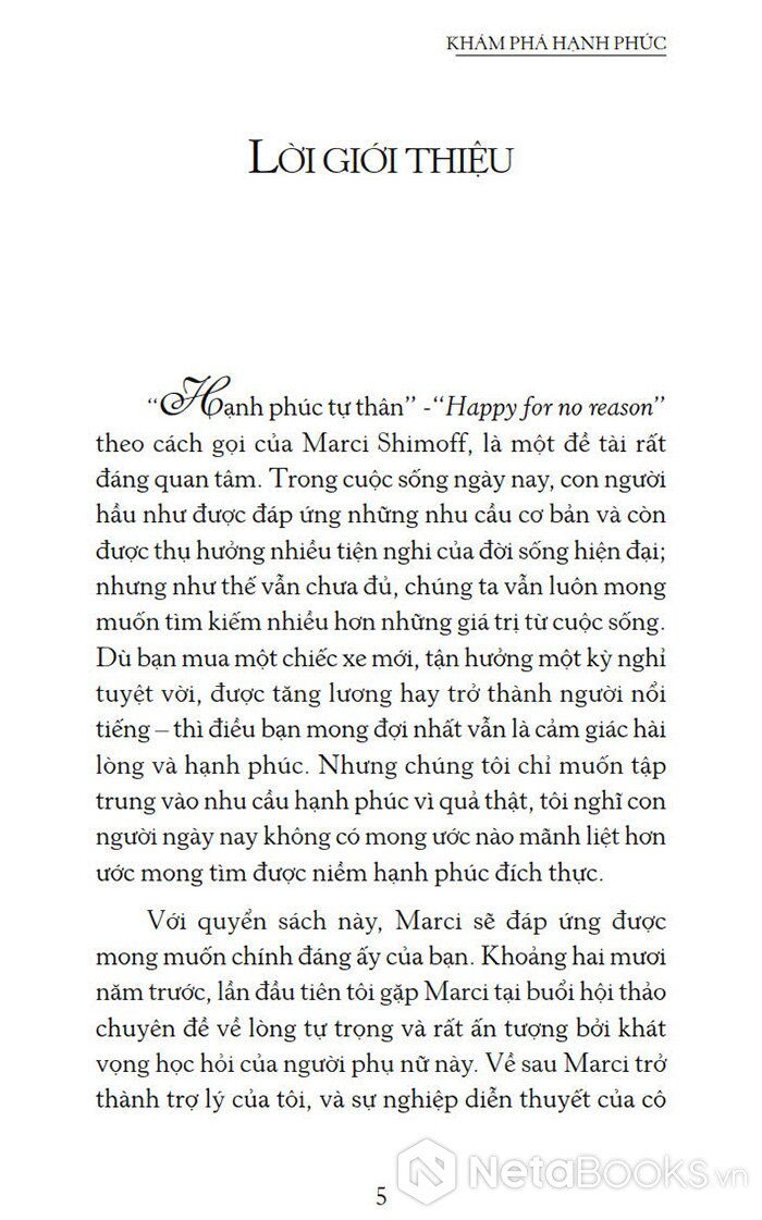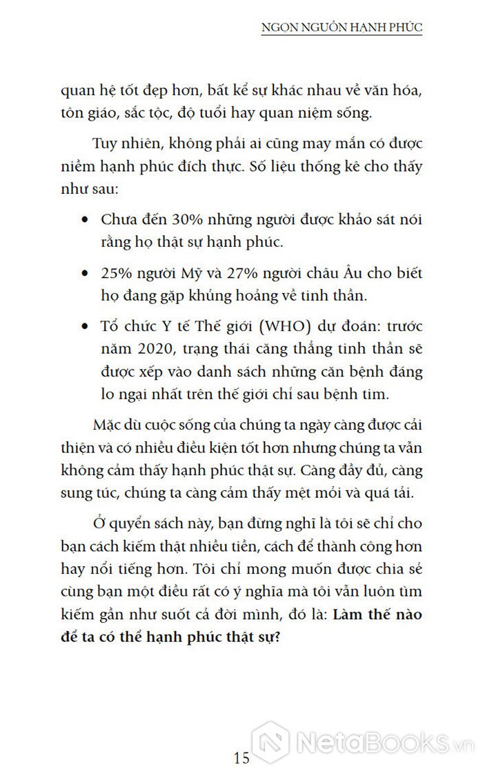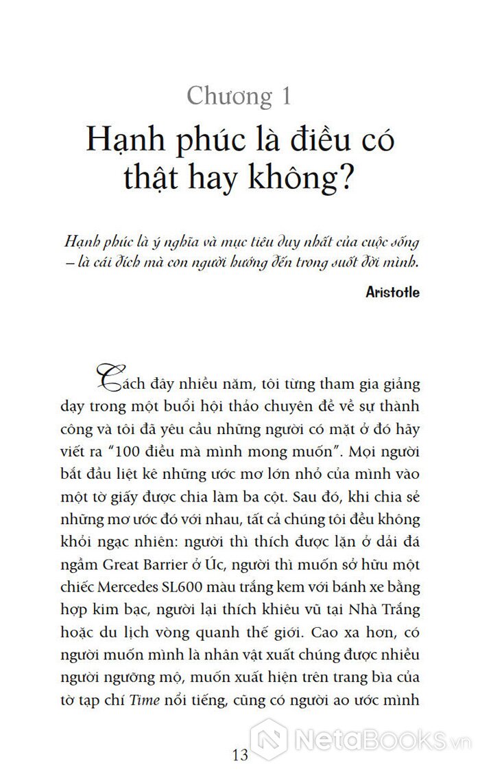 Dù bạn mua một chiếc xe mới, tận hưởng một kỳ nghỉ tuyệt vời, được tăng lương hay trở thành người nổi tiếng – thì điều bạn mong đợi nhất vẫn là cảm giác hài lòng và hạnh phúc. Và cuốn sách này tập trung nhiều vào nhu cầu hạnh phúc vì quả thật con người ngày nay không có mong ước nào mãnh liệt hơn ước mong tìm được niềm hạnh phúc đích thực.