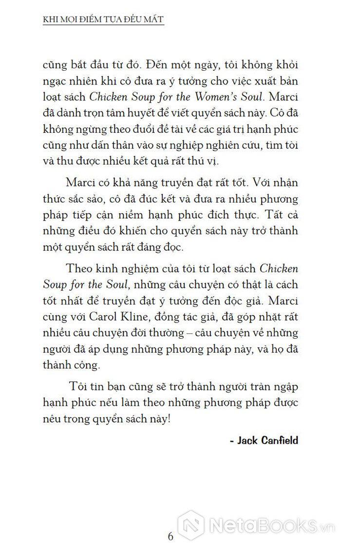 "Với Khi Mọi Điểm Tựa Đều Mất, Marci Shimoff đã có một cuộc cách mạng về hạnh phúc. Cuốn sách này trình bày một cách tiếp cận rộng rãi, dứt khoát để trở nên thực sự hạnh phúc kết hợp chiều sâu tinh thần tuyệt vời, nghiên cứu đỉnh cao và thực tiễn tâm lý. Tôi chắc chắn rằng bạn làm theo các thực hành trong cuốn sách mới rực rỡ của cô ấy, bạn cũng sẽ biểu lộ một đời hạnh phúc." - Jack Canfield, tác giả bộ sách Chicken soup for the soul