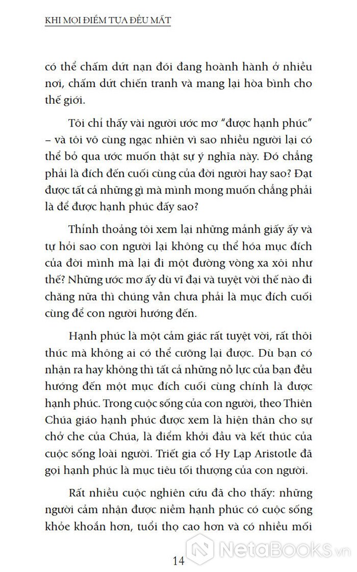 "Bạn không thể phụ thuộc vào hoàn cảnh bên ngoài để có được hạnh phúc lâu dài. Điều này phải đến từ bên trong bạn. Dựa trên nghiên cứu khoa học và kinh nghiệm của những người thực sự hạnh phúc, Khi Mọi Điểm Tựa Đều Mất chỉ cho bạn từng bước làm thế nào để nâng cao hạnh phúc của chính bạn." - Mehmet C. Oz, đồng tác giả của You: On a Diet và You: Staying Young