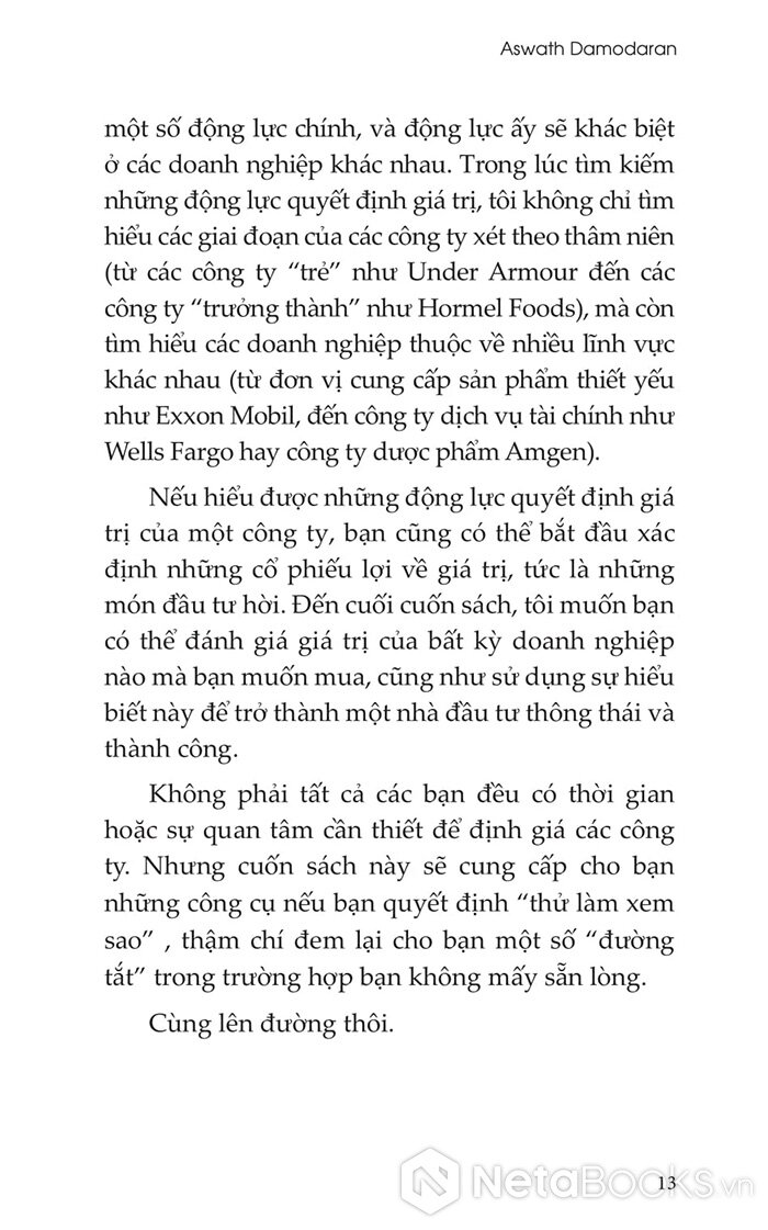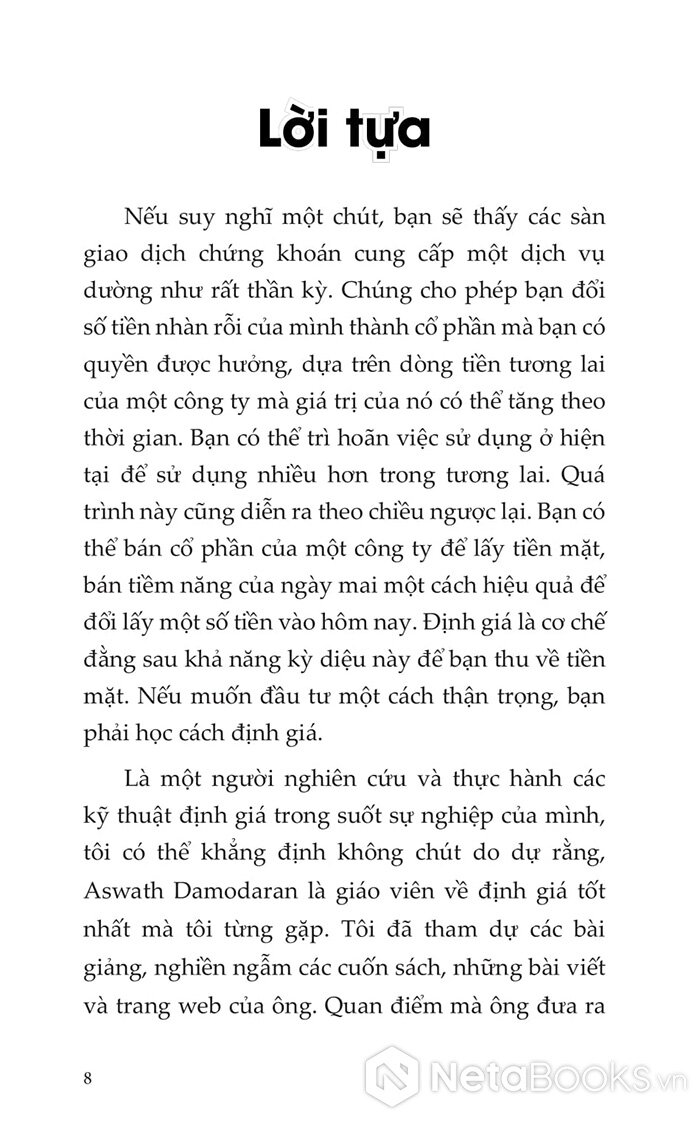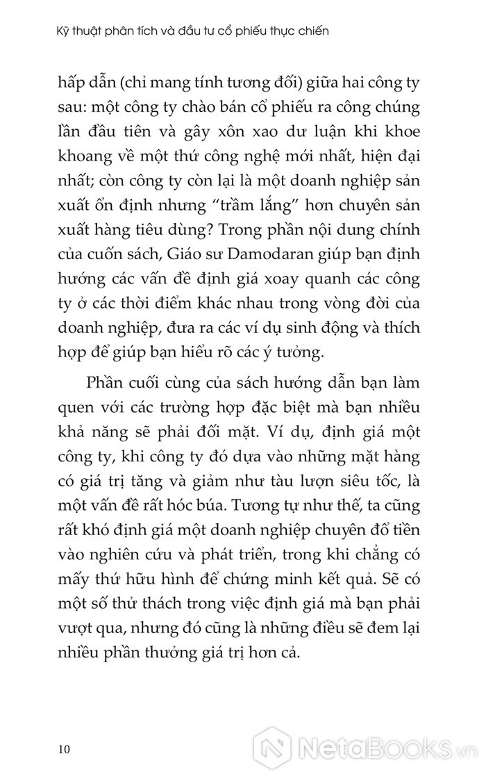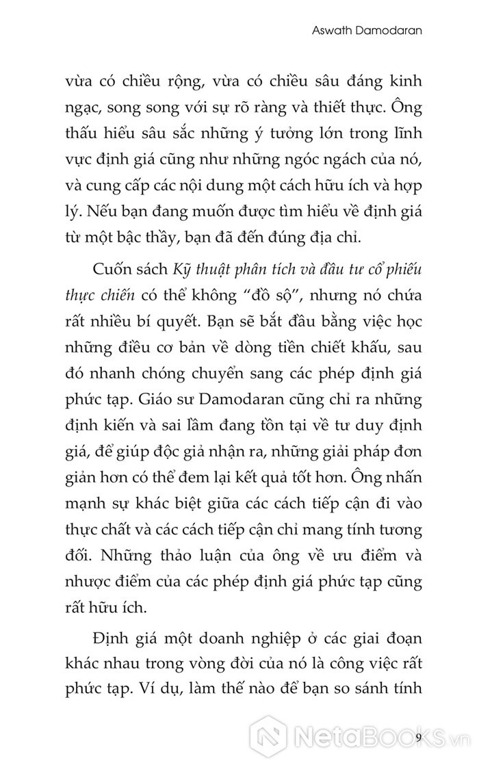 Cuốn sách còn chứa đựng nhiều ví dụ thực tiễn về cách Damodaran định giá các công ty thuộc mọi lĩnh vực và giai đoạn phát triển, từ đó rút ra kinh nghiệm quý báu cho chính mình. Những chỉ dẫn đáng tin cậy trong cuốn sách này không chỉ giúp bạn tự tin hơn khi định giá doanh nghiệp, mà còn tạo nền tảng để hiểu rõ và đánh giá các phân tích từ người khác - qua đó gia tăng lợi thế trên thị trường chứng khoán.