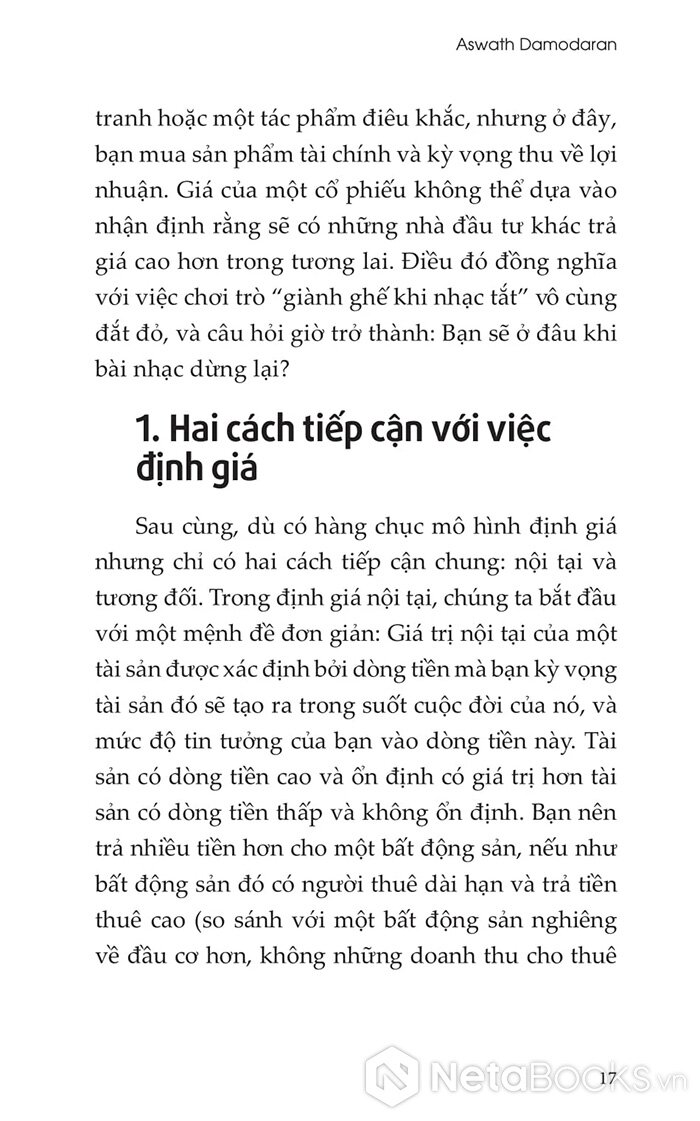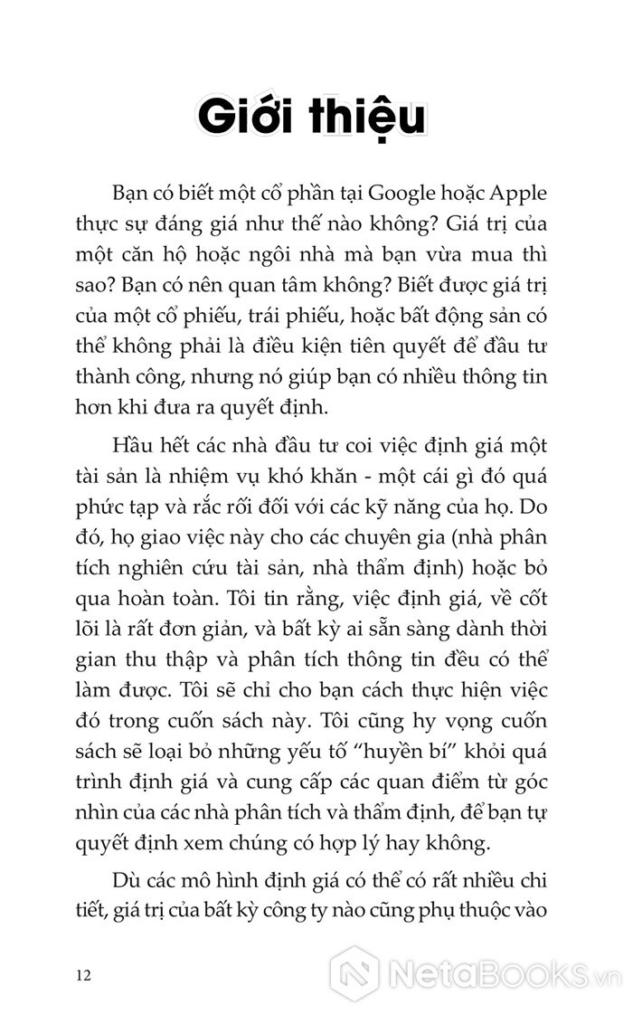 Tác giả Damodaran khẳng định: bản chất của định giá rất đơn giản. Bất kỳ ai sẵn sàng dành thời gian thu thập và phân tích thông tin đều có thể làm được. Xuyên suốt từng trang, Damodaran hệ thống hóa những nguyên tắc nền tảng, đồng thời phát triển các mô hình và công thức dễ hiểu, dễ áp dụng. Ông tập trung vào hai hướng tiếp cận chính: định giá nội tại và định giá tương đối, đồng thời chỉ ra cách vận dụng phù hợp cho từng doanh nghiệp, có điều chỉnh theo lợi nhuận, mức tăng trưởng và rủi ro đặc thù.