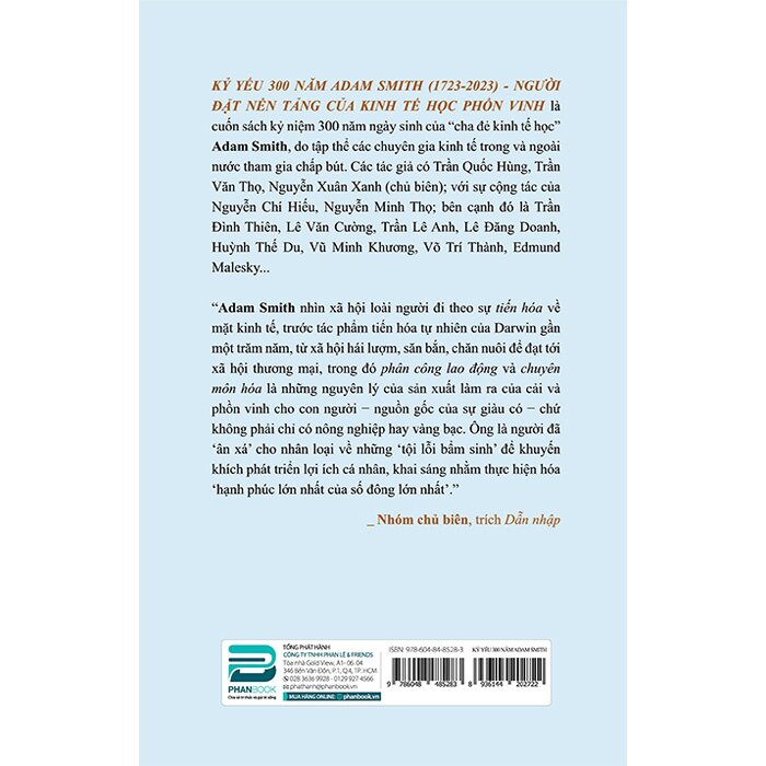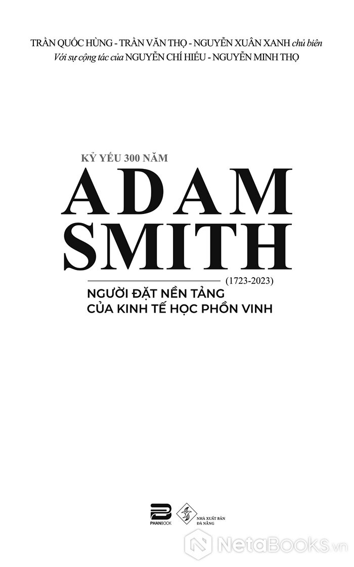 Kỷ yếu 300 năm Adam Smith (1723-2023) - Người đặt nền tảng của kinh tế học phồn vinh là cuốn sách được ra đời để kỷ niệm 300 năm ngày sinh của “cha đẻ” kinh tế học hiện đại Adam Smith (1723-2023), do Phanbook và NXB Đà Nẵng ấn hành. Đây là quyển sách đầu tiên về diện mạo và những đóng góp của ông cho lý thuyết kinh tế thế giới, do Trần Quốc Hùng - Trần Văn Thọ - Nguyễn Xuân Xanh chủ biên, với sự cộng tác, tham gia chấp bút của Nguyễn Chí Hiếu - Nguyễn Minh Thọ - Trần Lê Anh - Nguyễn Ngọc Anh - Nguyễn Tú Anh - Lê Văn Cường - Lê Đăng Doanh - Huỳnh Thế Du - Edmund Malesky - Emily Hamblin - Vũ Minh Khương - Hoàng Hải Vân…