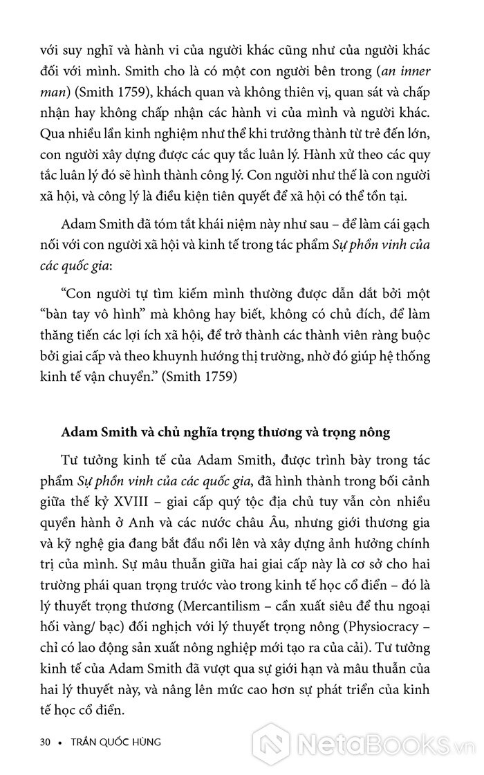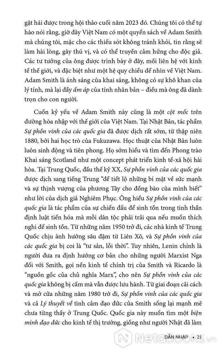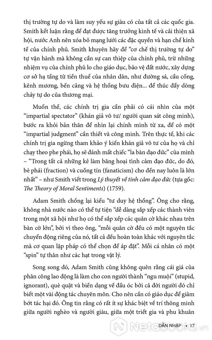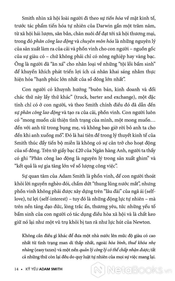 “Adam Smith nhìn xã hội loài người đi theo sự tiến hóa về mặt kinh tế, trước tác phẩm tiến hóa tự nhiên của Darwin gần một trăm năm, từ xã hội hái lượm, săn bắn, chăn nuôi để đạt tới xã hội thương mại, trong đó phân công lao động và chuyên môn hóa là những nguyên lý của sản xuất làm ra của cải và phồn vinh cho con người - nguồn gốc của sự giàu có - chứ không phải chỉ có nông nghiệp hay vàng bạc. Ông là người đã “ân xá cho nhân loại về những ‘tội lỗi bẩm sinh’ để khuyến khích phát triển lợi ích cá nhân, khai sáng nhằm thực hiện hóa ‘hạnh phúc lớn nhất của số đông lớn nhất.” - Nhóm chủ biên, trích Dẫn nhập