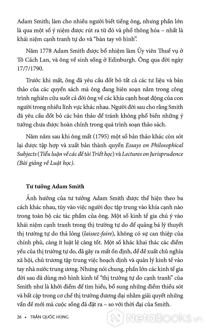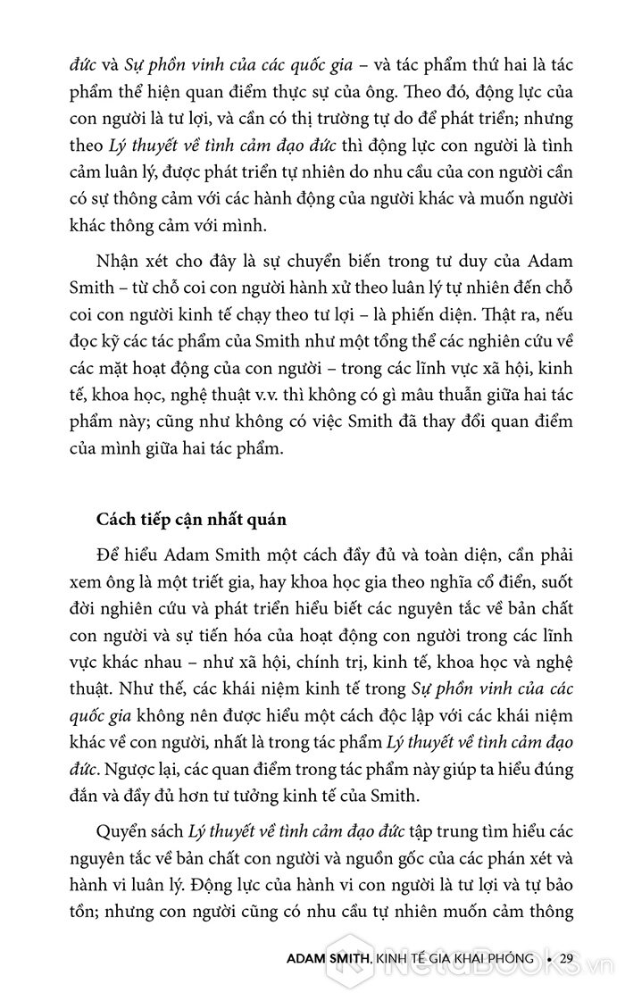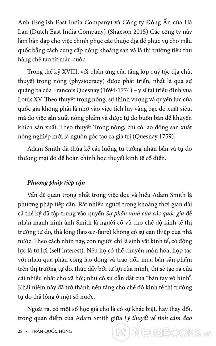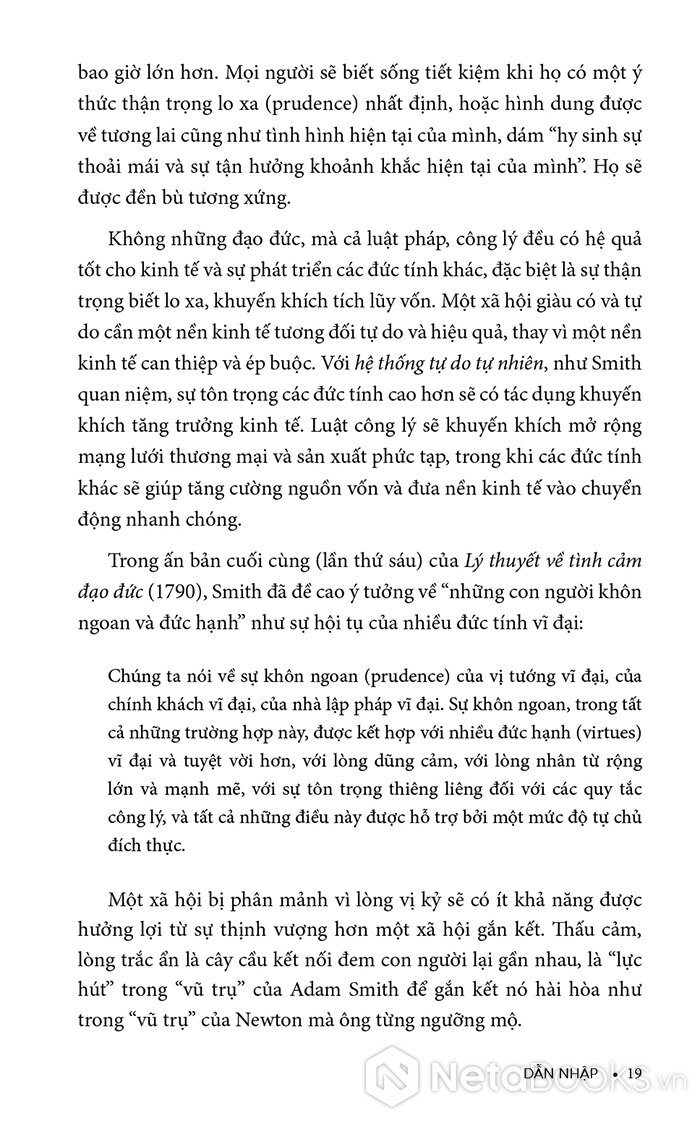 “Adam Smith nhìn xã hội loài người đi theo sự tiến hóa về mặt kinh tế, trước tác phẩm tiến hóa tự nhiên của Darwin gần một trăm năm, từ xã hội hái lượm, săn bắn, chăn nuôi để đạt tới xã hội thương mại, trong đó phân công lao động và chuyên môn hóa là những nguyên lý của sản xuất làm ra của cải và phồn vinh cho con người - nguồn gốc của sự giàu có - chứ không phải chỉ có nông nghiệp hay vàng bạc. Ông là người đã “ân xá cho nhân loại về những ‘tội lỗi bẩm sinh’ để khuyến khích phát triển lợi ích cá nhân, khai sáng nhằm thực hiện hóa ‘hạnh phúc lớn nhất của số đông lớn nhất.” - Nhóm chủ biên, trích Dẫn nhập