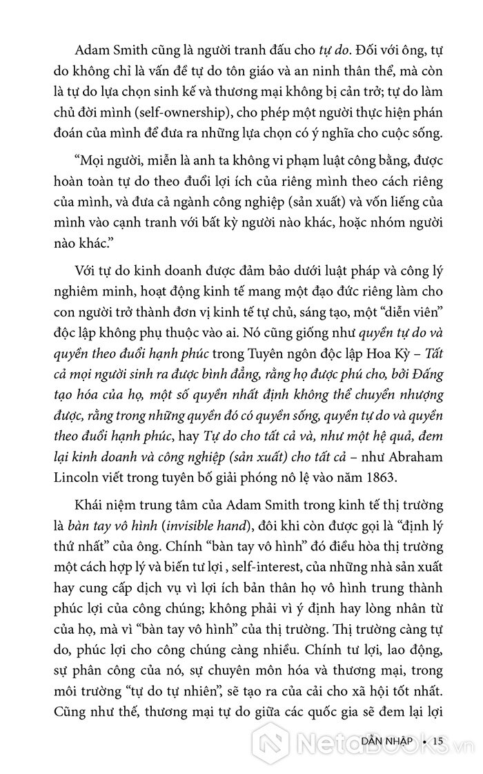 "Mỗi trang viết của Adam Smith đều được soi sáng bởi một niềm đam mê lớn, niềm đam mê cho tự do. Đây là lời đầu tiên và cũng là lời cuối cùng trong triết lý chính trị và công nghiệp của ông, cũng như là lời đầu tiên và lời cuối cùng trong triết lý chính trị và công nghiệp của thời đại này." - Arnold Toynbee, nhà kinh tế học và cải cách xã hội người Anh thế kỷ XIX