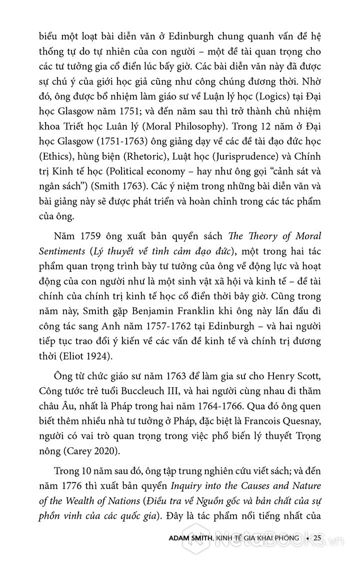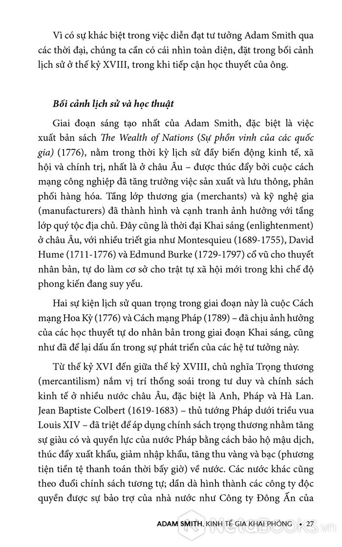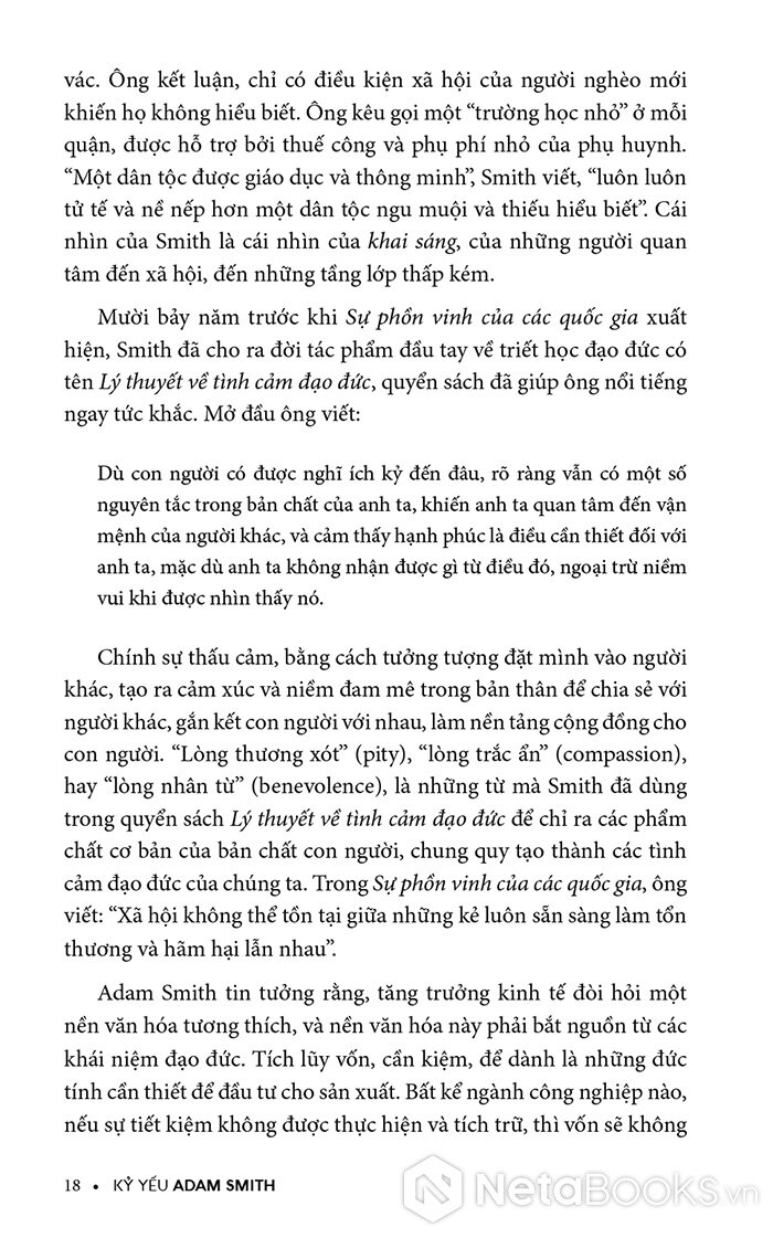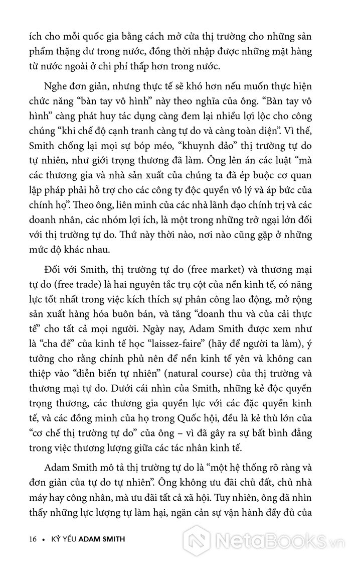 Trong gần 600 trang sách, các tác giả đã phác họa lại cuộc đời, bối cảnh lịch sử thời Adam Smith sinh sống, những yếu tố góp phần hun đúc nên tư tưởng quan trọng của ông; bên cạnh đó, các tác giả đã phóng chiếu, bàn sâu về sự ảnh hưởng của ông lên lý thuyết kinh tế thế giới, cho thấy tư tưởng vượt thời cùng những cấp tiến bên trong bộ óc lỗi lạc.