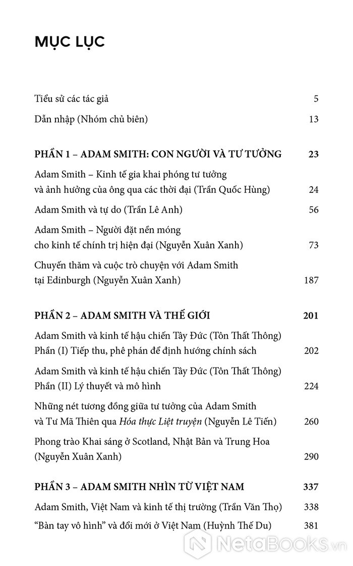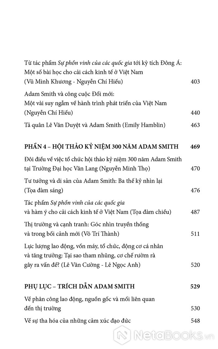Cuốn sách có 4 phần: phần 1 - Adam Smith: Con người và tư tưởng, phần 2 - Adam Smith và thế giới, phần 3 - Adam Smith nhìn từ Việt Nam và phần 4 - Hội thảo kỷ niệm 300 năm Adam Smith. Cùng với đó là phần Phụ lục trích dịch 2 tác phẩm quan trọng nhất của ông - Sự phồn vinh của các quốc gia và Lý thuyết về tình cảm đạo đức.