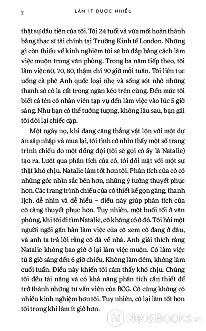 Mỗi chương sách đều cung cấp những câu hỏi gợi mở và nhận định quan trọng để bạn tự đánh giá hiệu suất cá nhân, nhận diện điểm mạnh và điểm yếu trong công việc. Sau khi hiểu rõ phong cách làm việc của mình, bạn sẽ được hướng dẫn qua các ví dụ thực tiễn, câu hỏi trắc nghiệm và các mẹo cụ thể để xây dựng chiến lược làm việc hiệu quả hơn. "Làm ít được nhiều" là một cuốn sách toàn diện, dễ tiếp cận và gần gũi, giúp bạn đạt được nhiều hơn bằng cách làm ít hơn - với nền tảng là những phân tích dữ liệu chưa từng có.