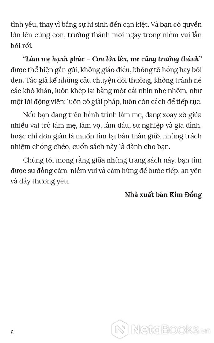 Nếu bạn đang trên hành trình làm mẹ, đang xoay xở giữa nhiều vai trò làm mẹ, làm vợ, làm dâu, sự nghiệp và gia đình, hoặc chỉ đơn giản là muốn tìm lại bản thân giữa những trách nhiệm chồng chéo, cuốn sách Làm Mẹ Hạnh Phúc - Con Lớn Lên, Mẹ Cũng Trưởng Thành hứa hẹn sẽ phần nào giúp bạn cảm nhận được sự đồng cảm, tìm thấy niềm vui và cảm hứng để bước tiếp, an yên và đầy thương yêu.