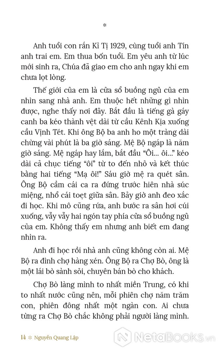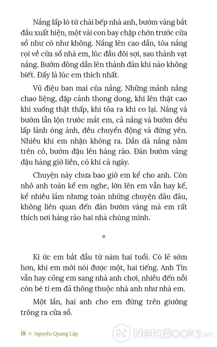 “Khăn bịt mắt được tháo, sau chút lóa mắt, anh nhìn quanh tìm em rất nhanh. Em vụt đứng dậy. Tụi lính không kịp kéo em về chỗ. Chúng không hiểu anh và em muốn gì. Anh đã nhìn thấy em. Mắt anh rực sáng. Chưa khi nào mắt anh rực sáng như hôm nay.” - Nguyễn Quang Lập