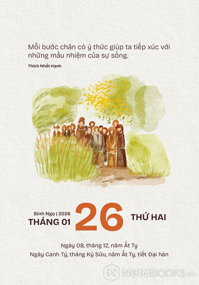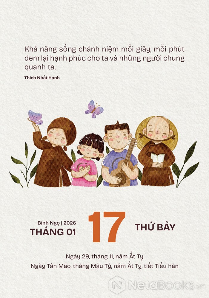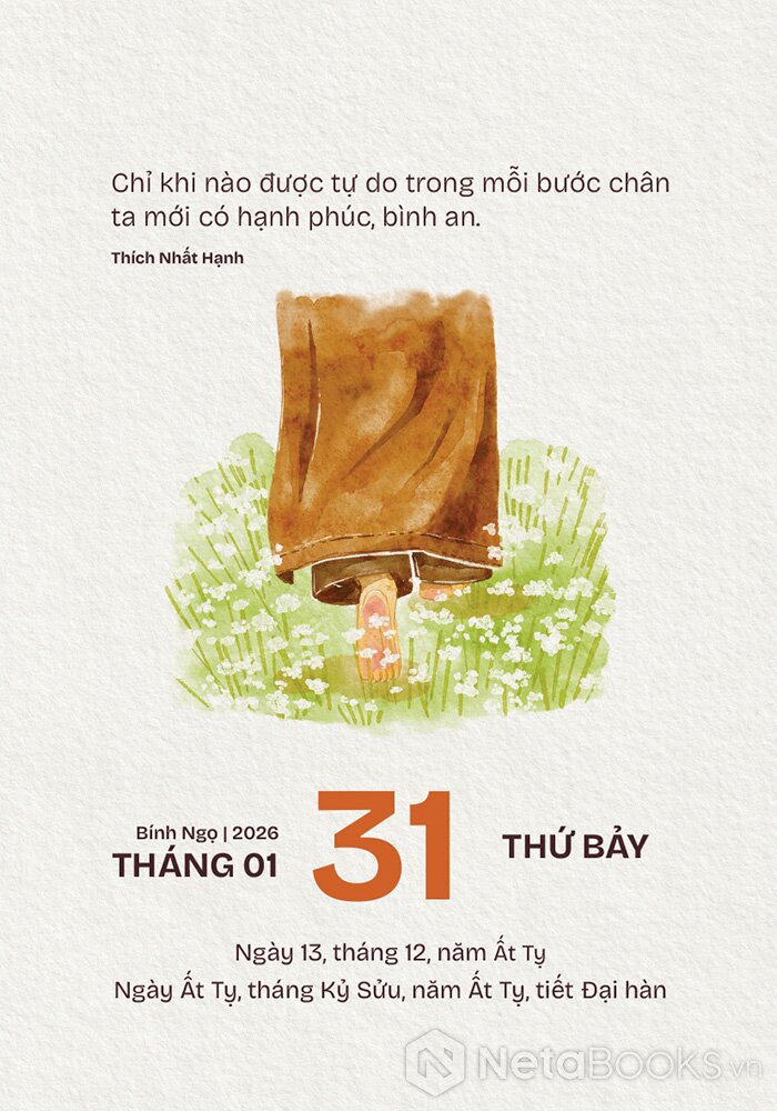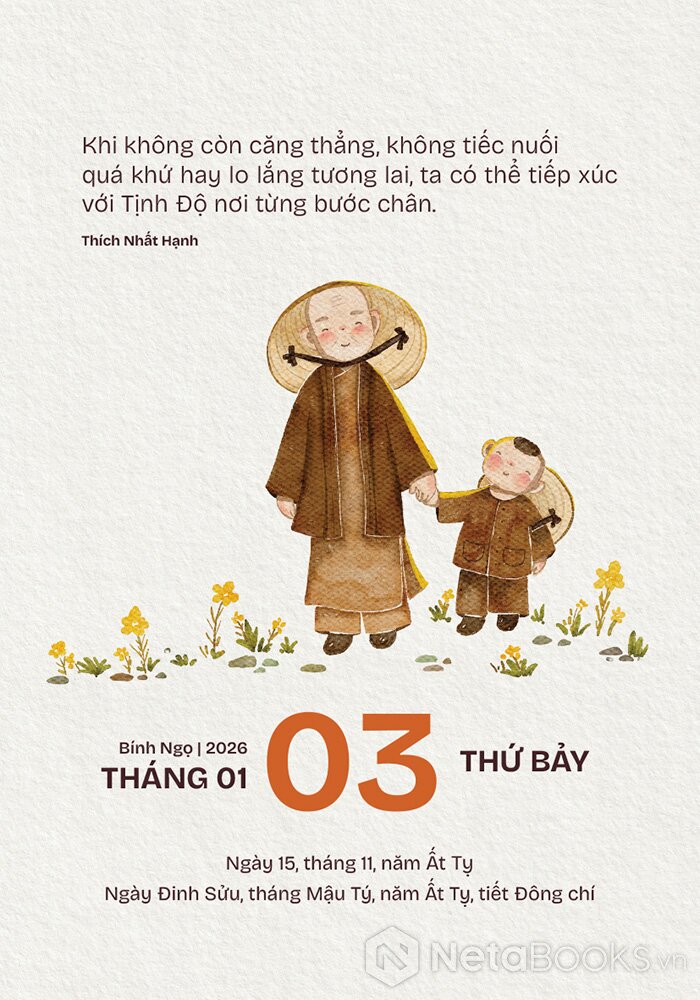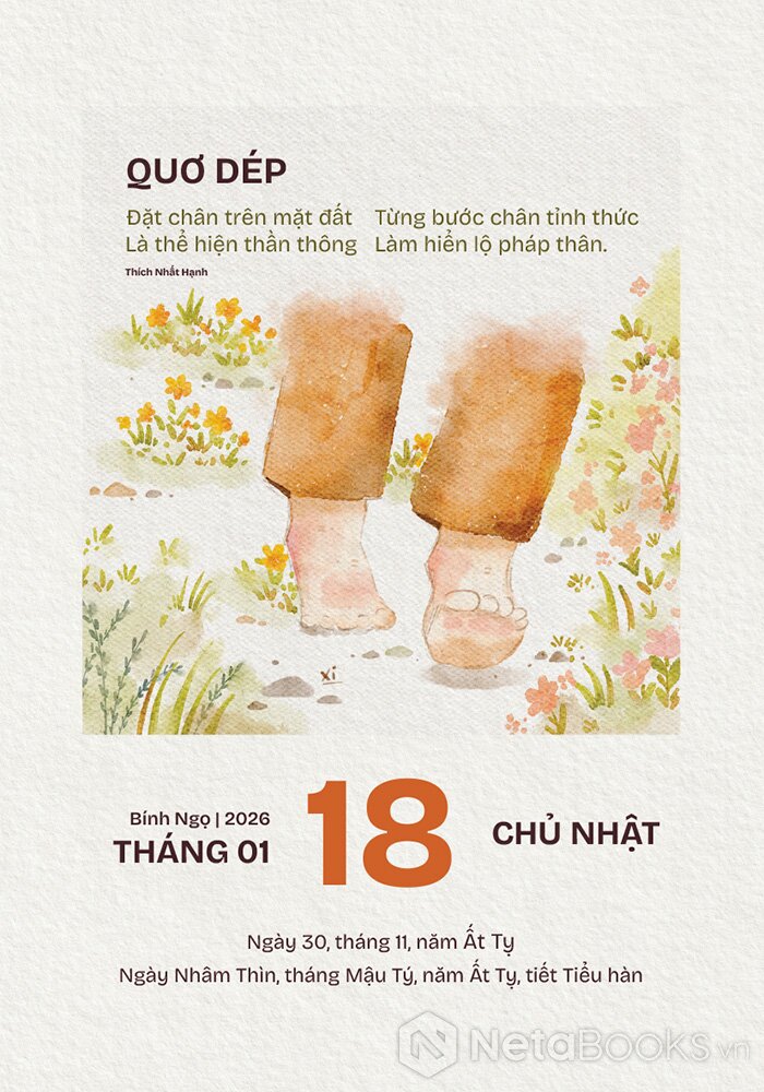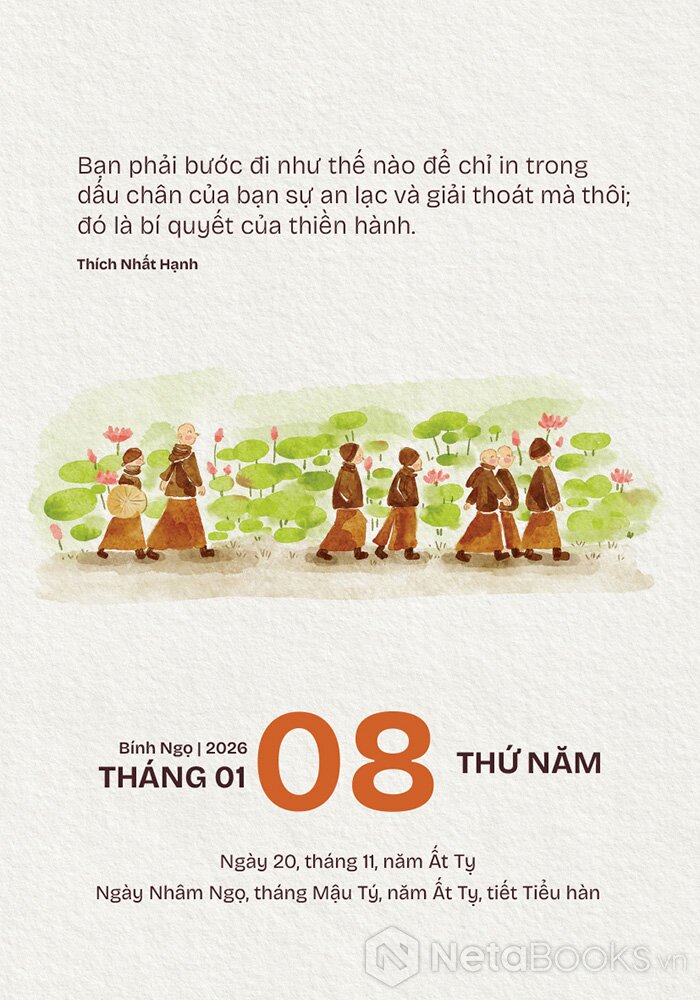 Ba trăm sáu mươi lăm ngày là một cơ hội lớn để chúng ta chế tác niềm vui, hạnh phúc cho chính mình và cho đoàn thể, xã hội. Mỗi khi chúng ta mỉm cười theo dõi hơi thở hay đi từng bước chân thảnh thơi và vững chãi, ta đang tiếp nối công trình của ông bà tổ tiên. Các thế hệ đi trước đã cùng nhau xây dựng một quá khứ và chúng ta đang kiến tạo nên hiện tại và tương lai. Bước chân nào của ta đặt trong ánh sáng chánh niệm cũng có công năng lắng dịu và chuyển hóa. Phẩm chất đời sống ta phụ thuộc vào phẩm chất ý thức sáng tỏ trong mỗi bước chân ta. Làm cho lòng đất nở hoa là một điều ta có thể thực hiện trong mỗi bước ta đi. Nhìn cho sâu thì ta thấy rõ rằng Đất Mẹ luôn có mặt để chuyên chở, nuôi lớn ta và các thế hệ con cháu của ta. Mỗi ngày nhìn lên tờ lịch, ta được tiếp thêm niềm vui trong sự thực tập; nhờ đó, ta luôn nhận được sự có mặt và yểm trợ từ Tăng thân khắp chốn.