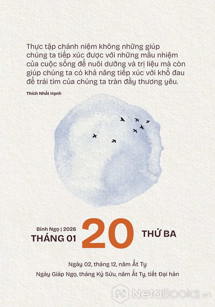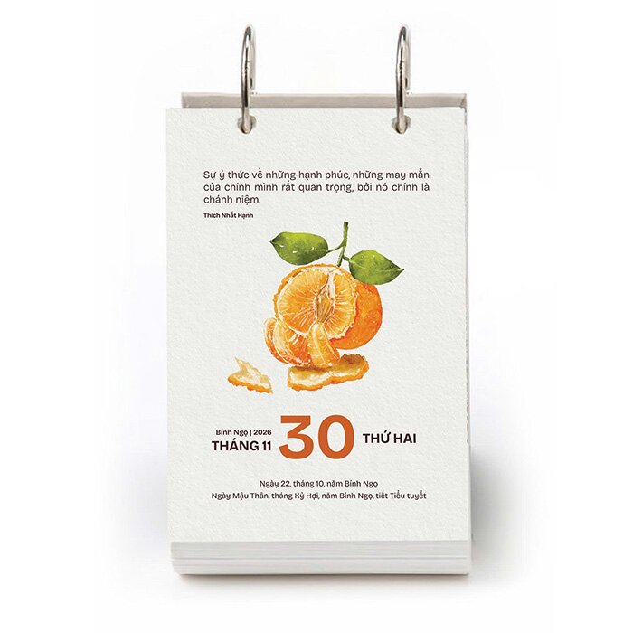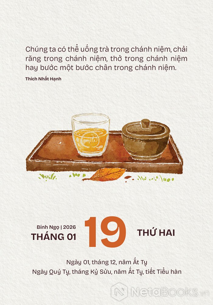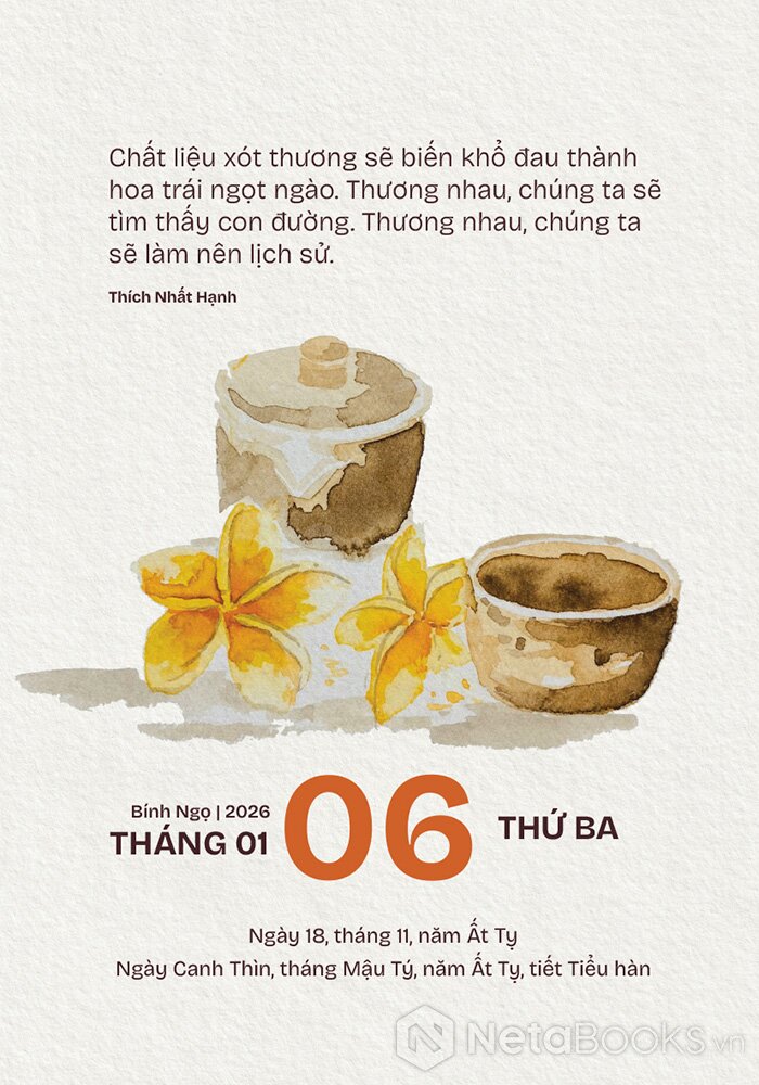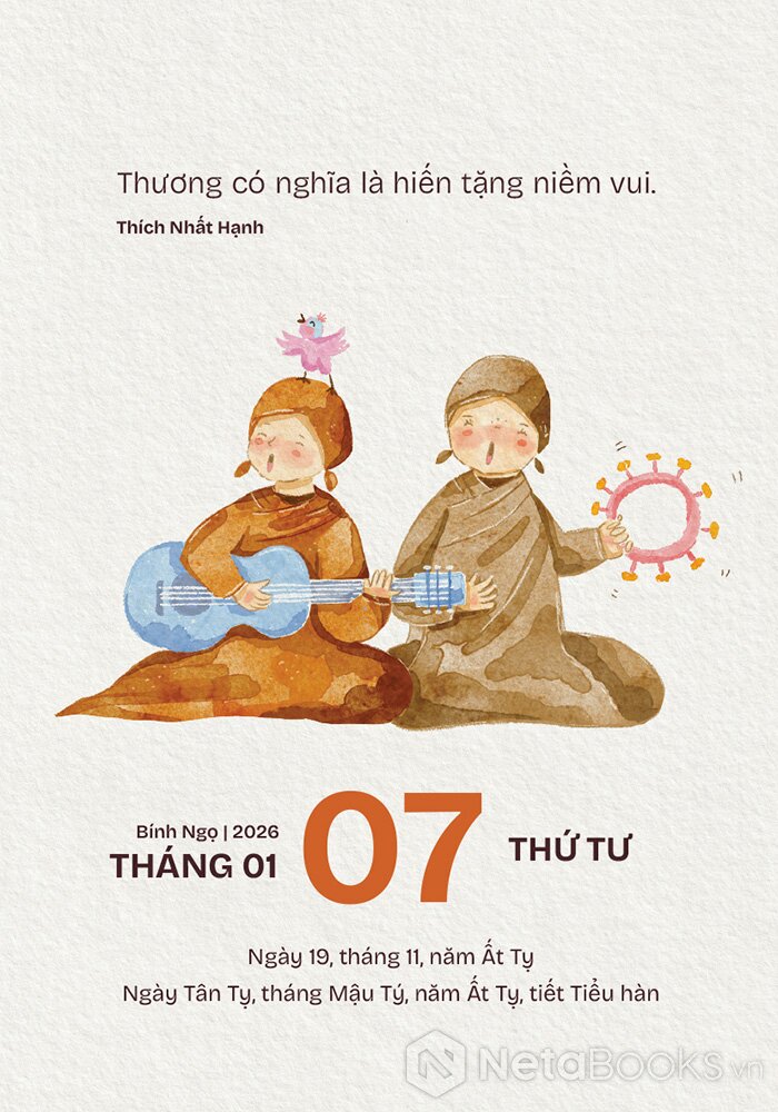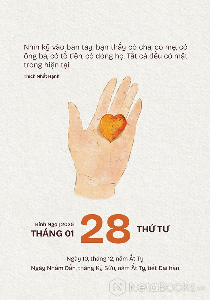 Ba trăm sáu mươi lăm ngày là một cơ hội lớn để chúng ta chế tác niềm vui, hạnh phúc cho chính mình và cho đoàn thể, xã hội. Mỗi khi chúng ta mỉm cười theo dõi hơi thở hay đi từng bước chân thảnh thơi và vững chãi, ta đang tiếp nối công trình của ông bà tổ tiên. Các thế hệ đi trước đã cùng nhau xây dựng một quá khứ và chúng ta đang kiến tạo nên hiện tại và tương lai. Bước chân nào của ta đặt trong ánh sáng chánh niệm cũng có công năng lắng dịu và chuyển hóa. Phẩm chất đời sống ta phụ thuộc vào phẩm chất ý thức sáng tỏ trong mỗi bước chân ta. Làm cho lòng đất nở hoa là một điều ta có thể thực hiện trong mỗi bước ta đi. Nhìn cho sâu thì ta thấy rõ rằng Đất Mẹ luôn có mặt để chuyên chở, nuôi lớn ta và các thế hệ con cháu của ta. Mỗi ngày nhìn lên tờ lịch, ta được tiếp thêm niềm vui trong sự thực tập; nhờ đó, ta luôn nhận được sự có mặt và yểm trợ từ Tăng thân khắp chốn.